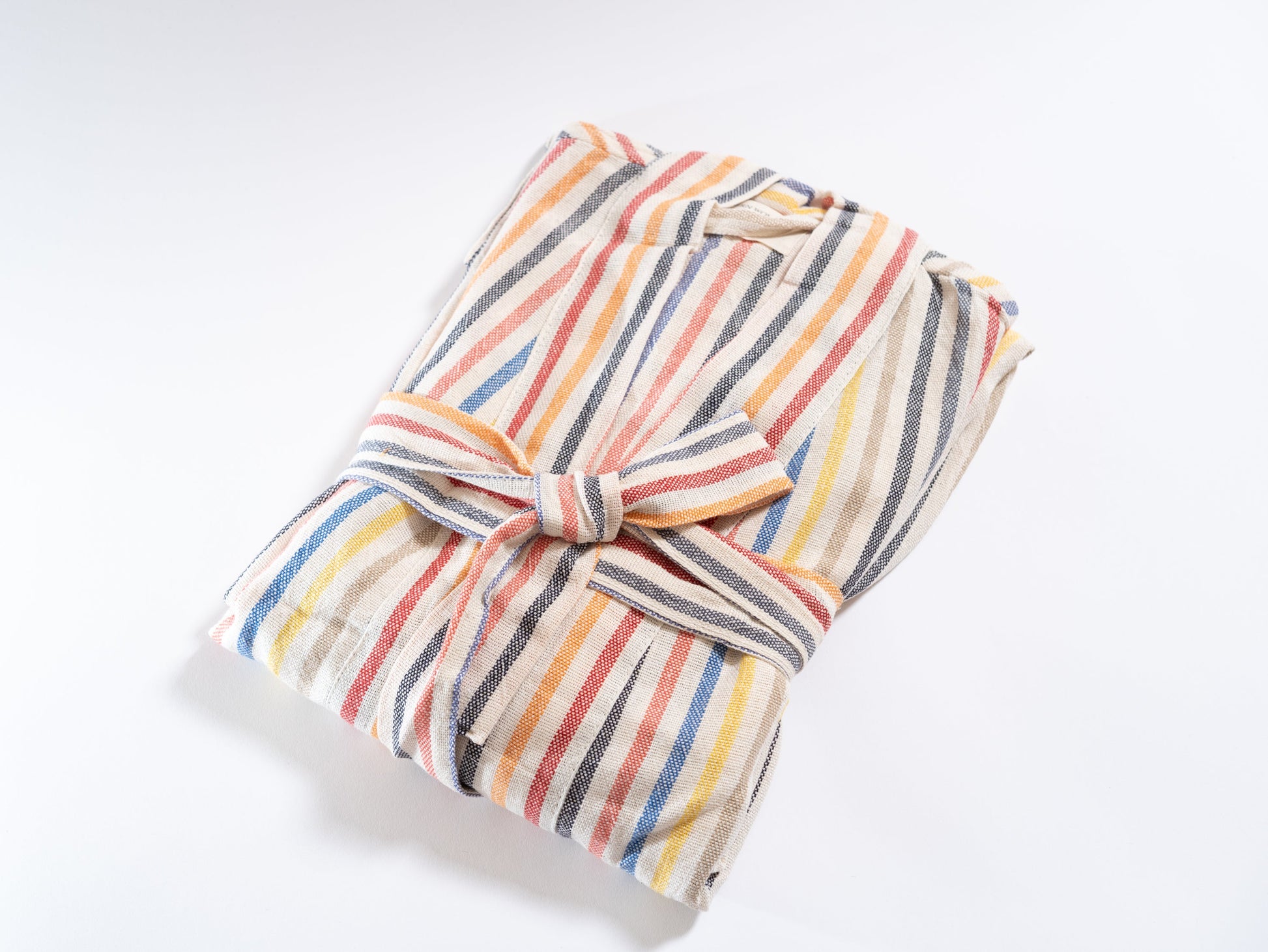 Brighten up your lounging experience with the Rainbow Robe, a vibrant and comfortable robe that wraps you in a burst of colors. Made from a soft cotton-linen blend, this robe features a lively striped pattern with hues of red, blue, yellow, beige, and charcoal, adding a cheerful touch to your everyday relaxation. Perfect for mornings at home, poolside lounging, or as a stylish cover-up after a bath.