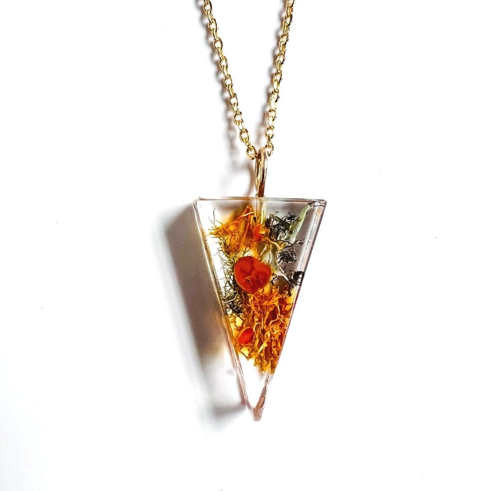 Resin Triangle Pendant Necklace with Moss and Lichen