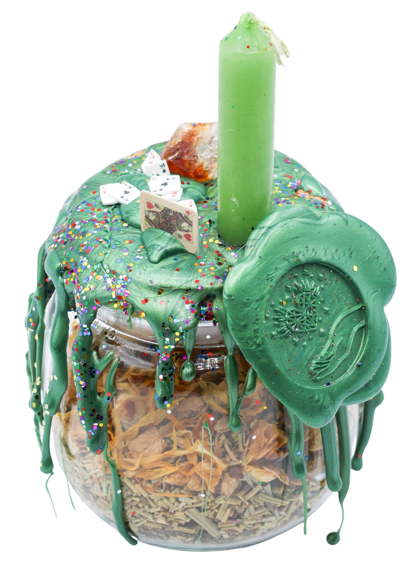 All spell jars are handmade, and variations in herbs, crystals, and ceremonial objects may occur. These differences make each jar one-of-a-kind, infused with its own special energy.