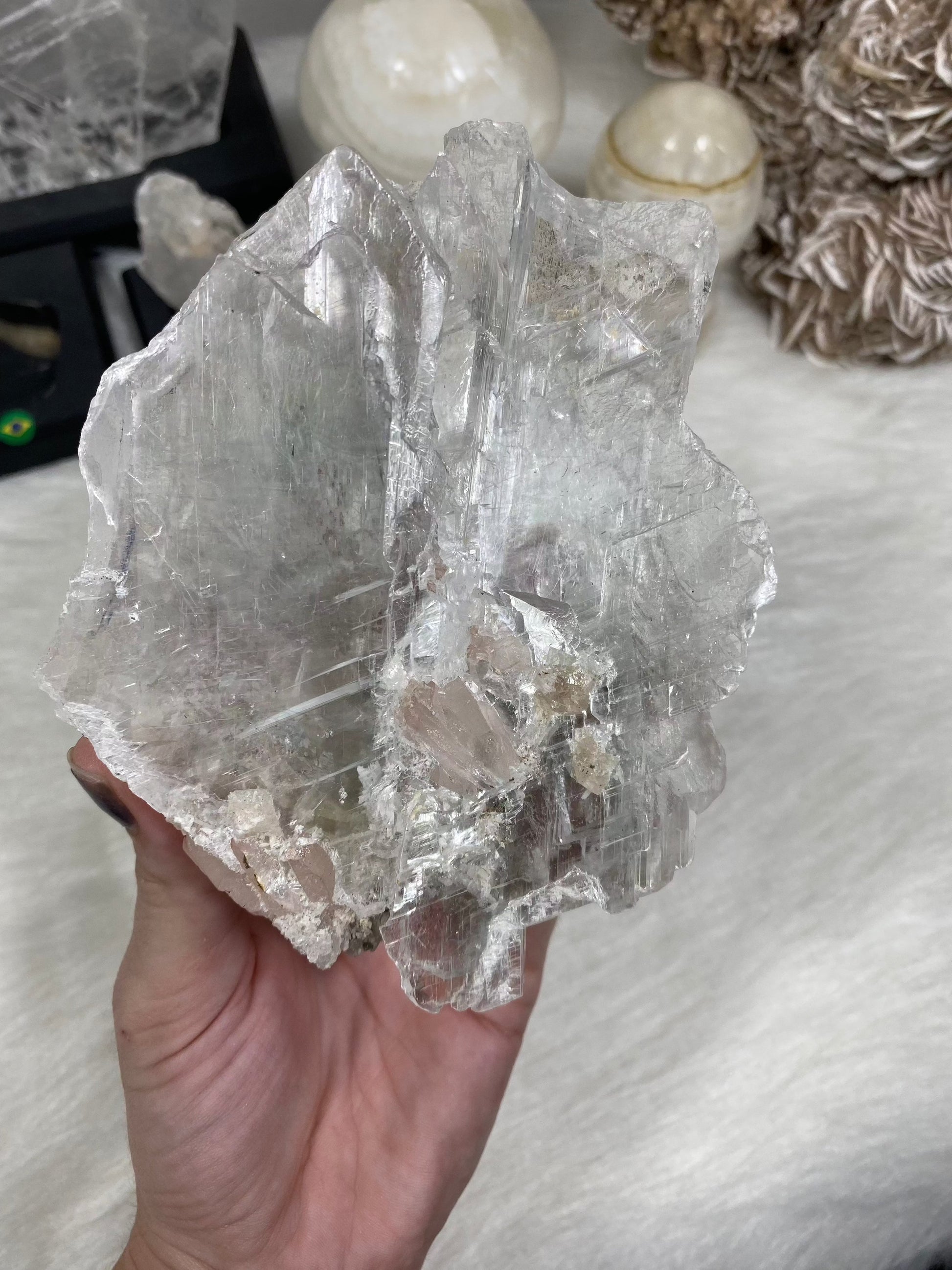 Raw Slice of ice-clear Selenite from Rio Grande do Sul, Brazil. Stunning reflective luster and natural lines of growth with light pink Calcite near the base. A custom-crafted wooden base is fitted to the exact piece you will receive, please take care when fitting it into the base as these minerals are delicate.