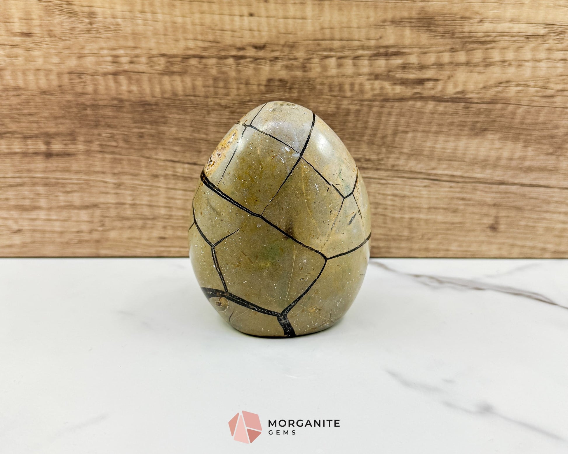 Presenting Septarian Dragon Egg Druzy Geode No. 1, a captivating and rare specimen shaped like an egg and adorned with internal druzy quartz crystals. The piece measures approximately 4.2″ × 3.3″ × 3.1″ and weighs 1.83 lb. Its earthy matrix contrasts beautifully with shimmering crystal interiors, making it a standout in any collection.