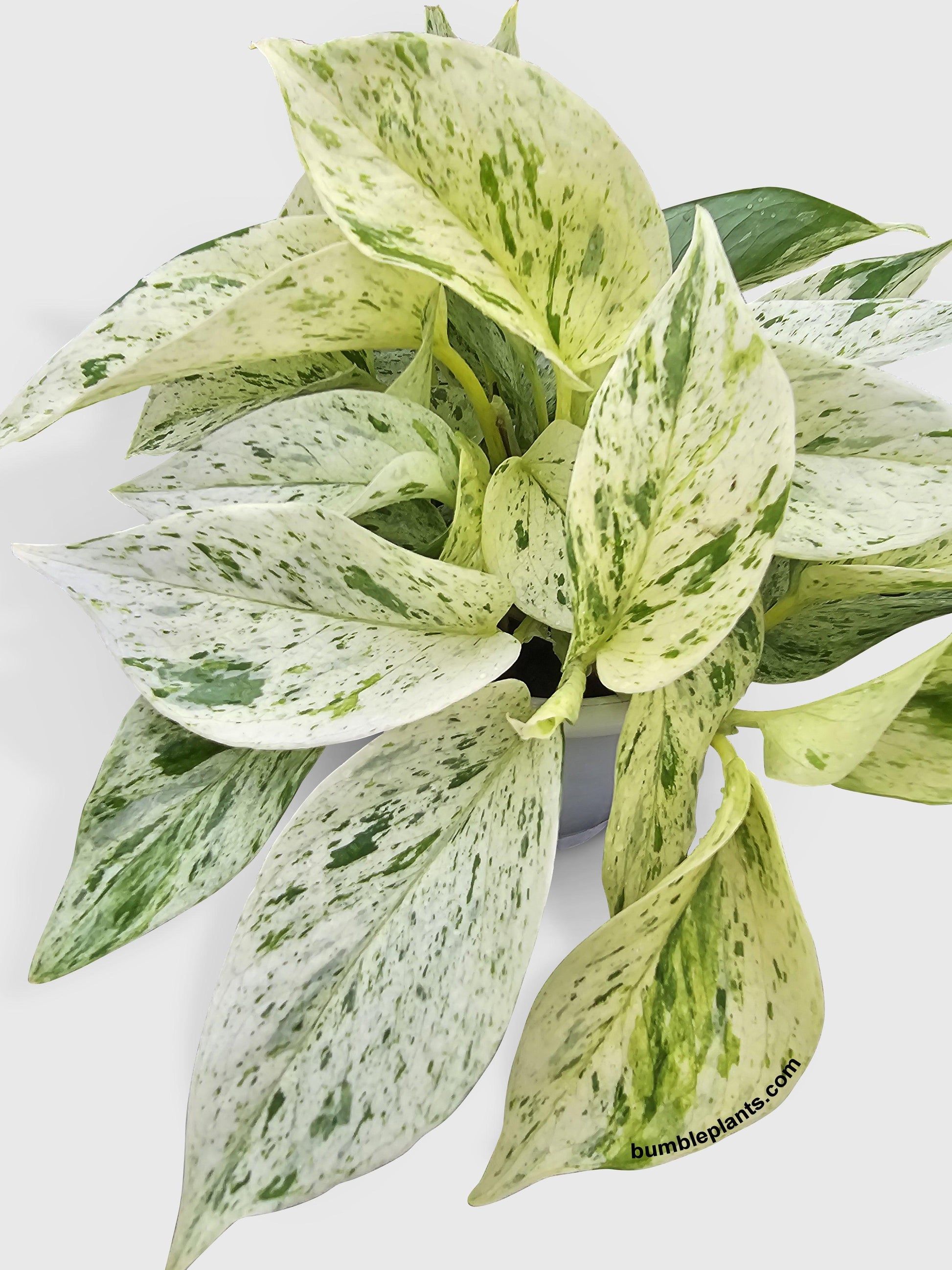 The Snow White Icy Pothos is known for its heavily variegated leaves that look like speckles of cream, light green, and dark green. They are some of the easiest indoor plants around and they have an air purifying super power.
