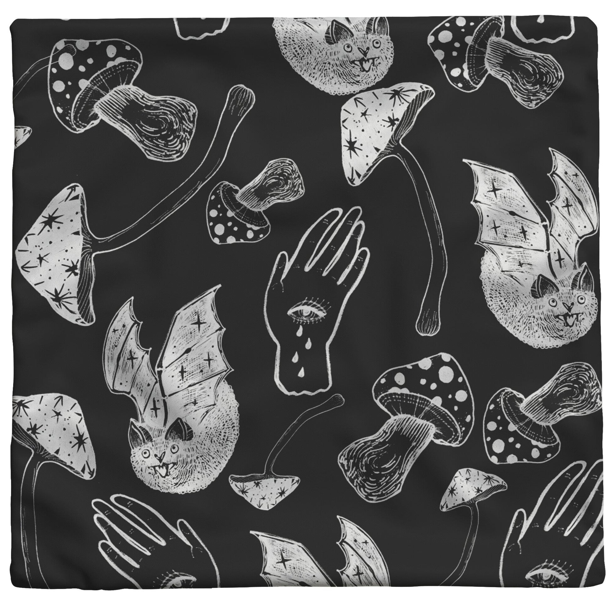 Enchant your space with the “Spooky Spells, Bats, and Mushrooms” Throw Pillow, featuring hand-drawn mushrooms, mystical hands, and adorable bats in crisp white on a deep black background.
