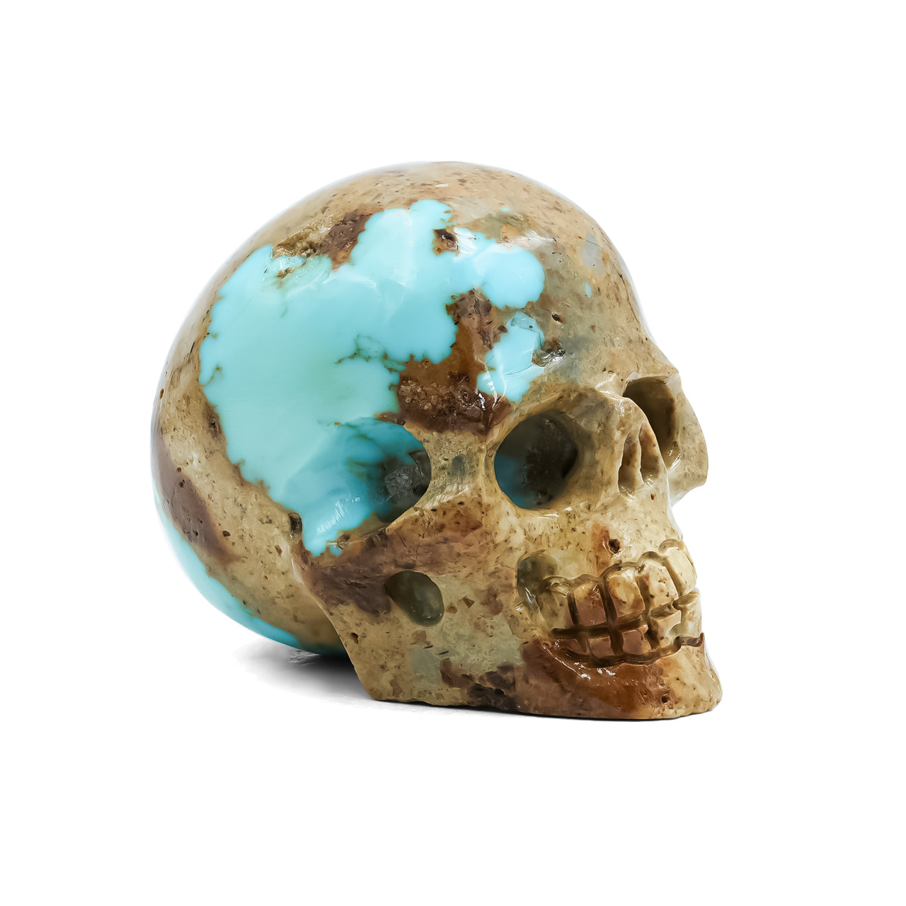 - A true masterpiece! This hand-carved New Arizona Turquoise skull features a striking blend of earthy tones and vibrant blue hues with finely sculpted details. A one-of-a-kind treasure, never to be repeated.