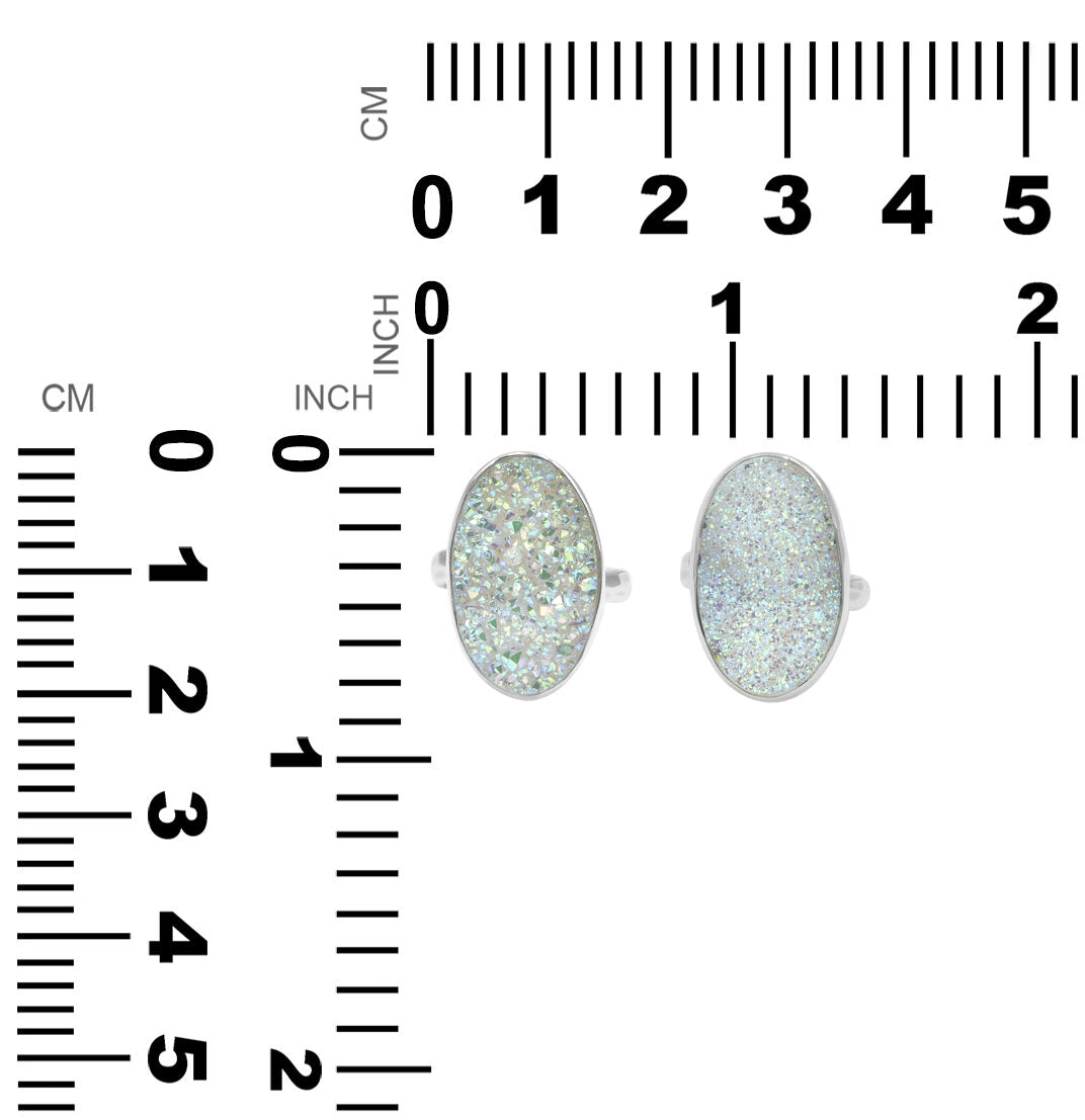- The ring features an oval-shaped piece of 25x15 mm iridescent Quartz Drusy with filigree-style back details. This dazzling ring measures approximately 26 mm in length, including the bezel.