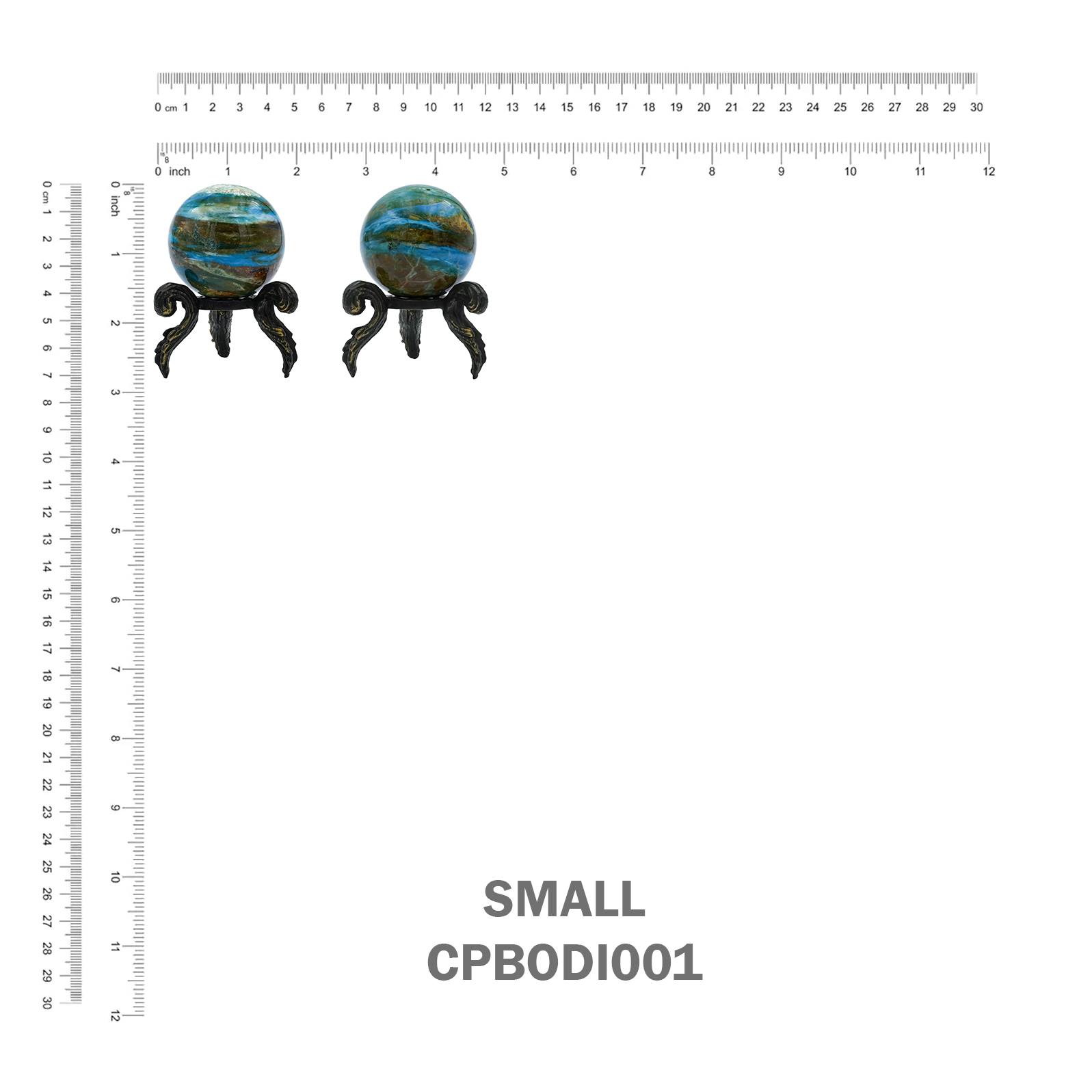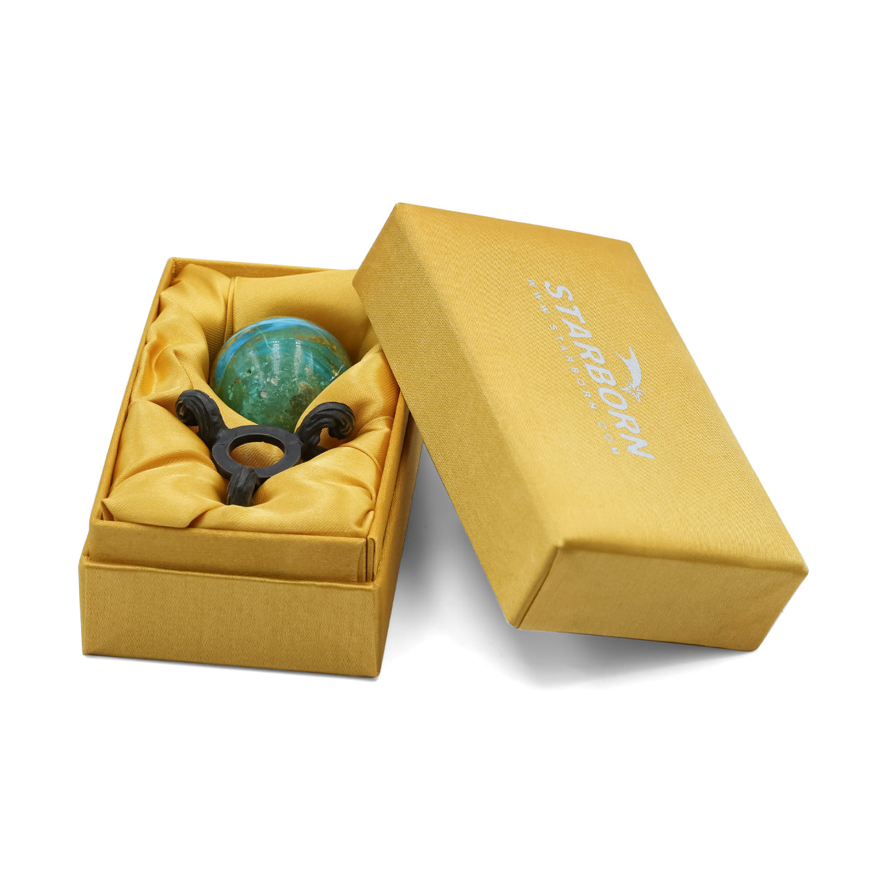 - Artfully crafted Peruvian Blue Opal sphere displayed on a decorative brass stand. Each piece comes elegantly packaged in a golden Starborn gidt box, perfect for gifting or display. Available in two sizes: