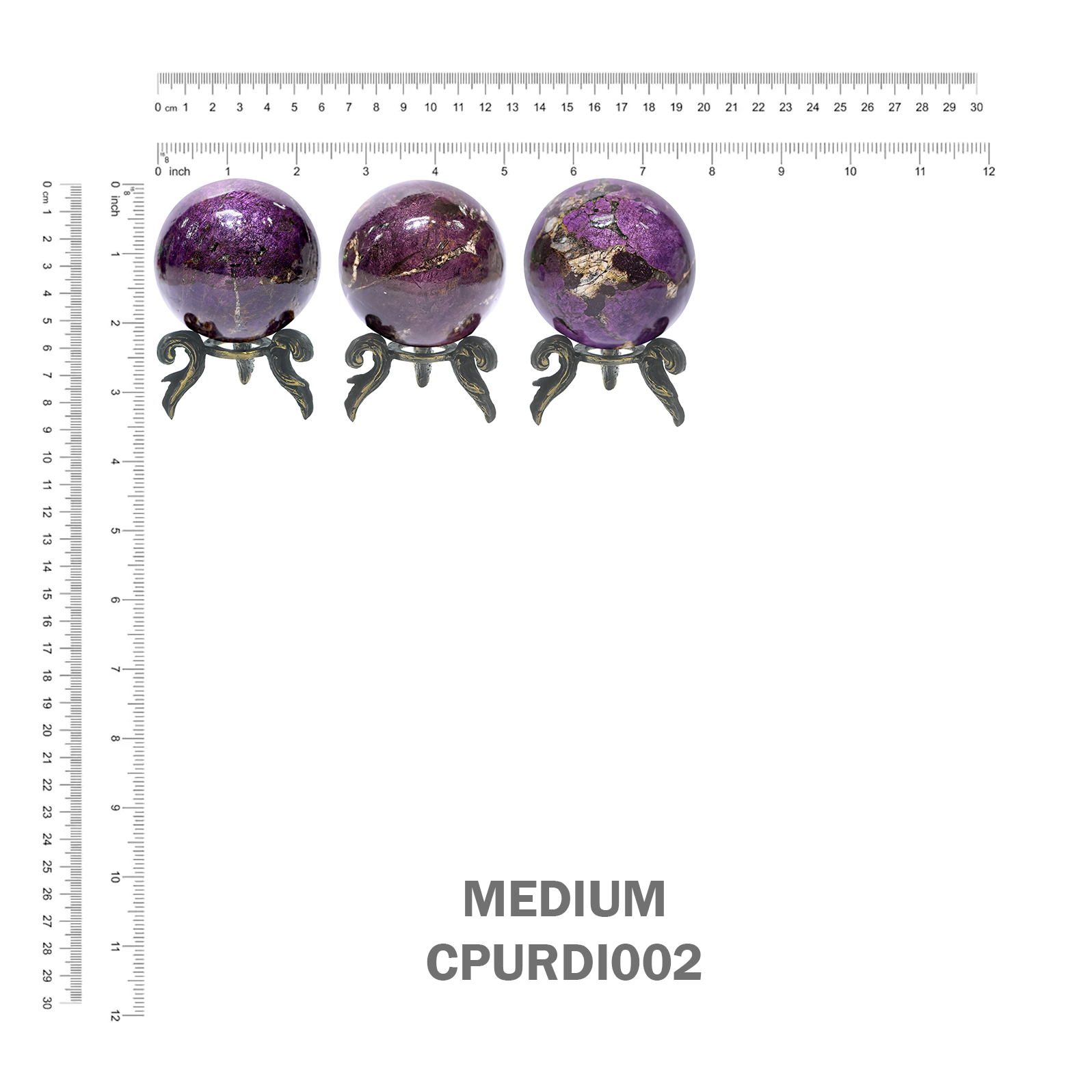 - Purpurite Sphere, complete with a decorative brass stand. This artfully crafted sphere is available in 3 sizes: