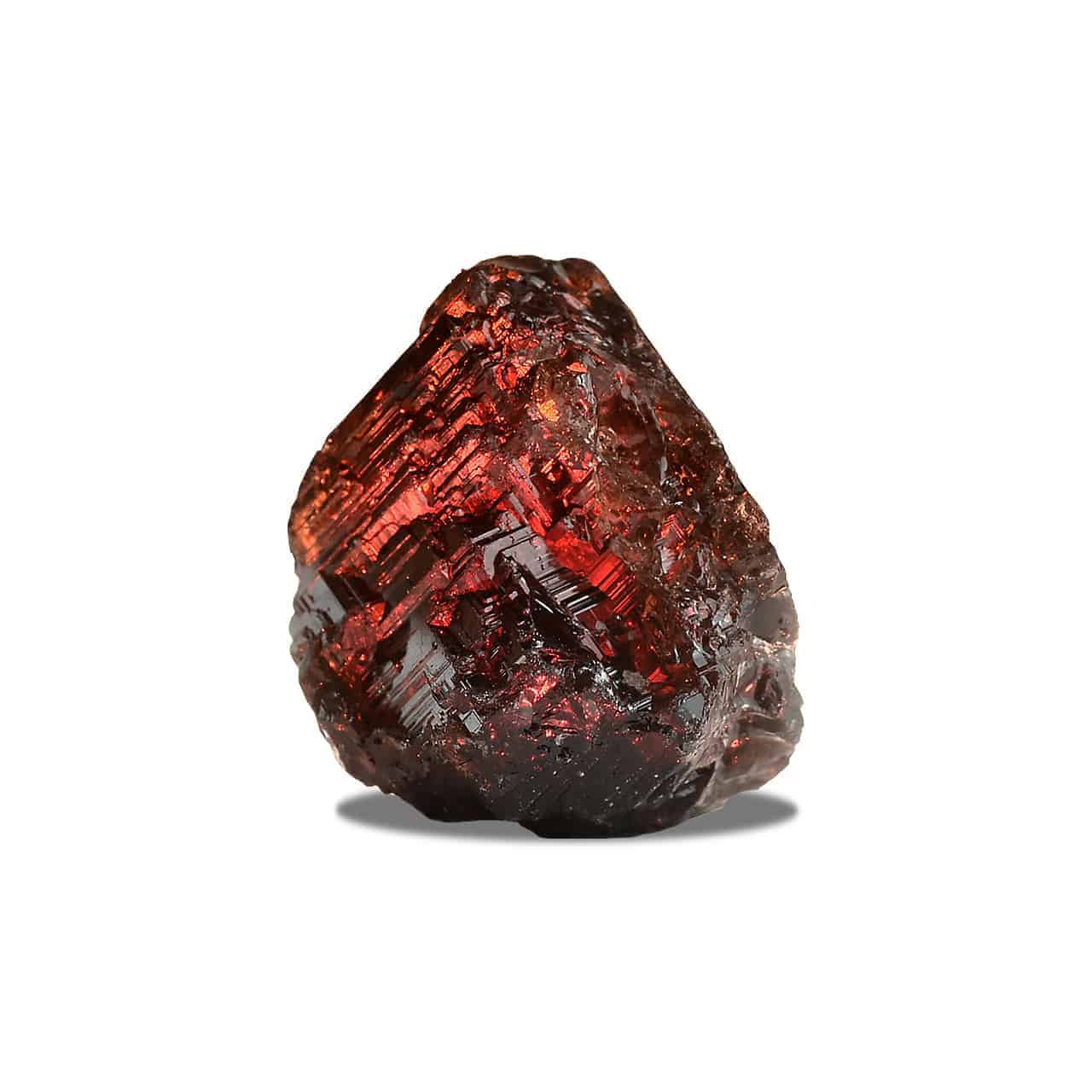 - Glassy etched Spessartine Garnet floater crystal with dark orange/red colored gemmy internals. The luster is mirror bright on the complex stepped faces, glowing deep red when backlit, and the specimen shows terminations all the way around.