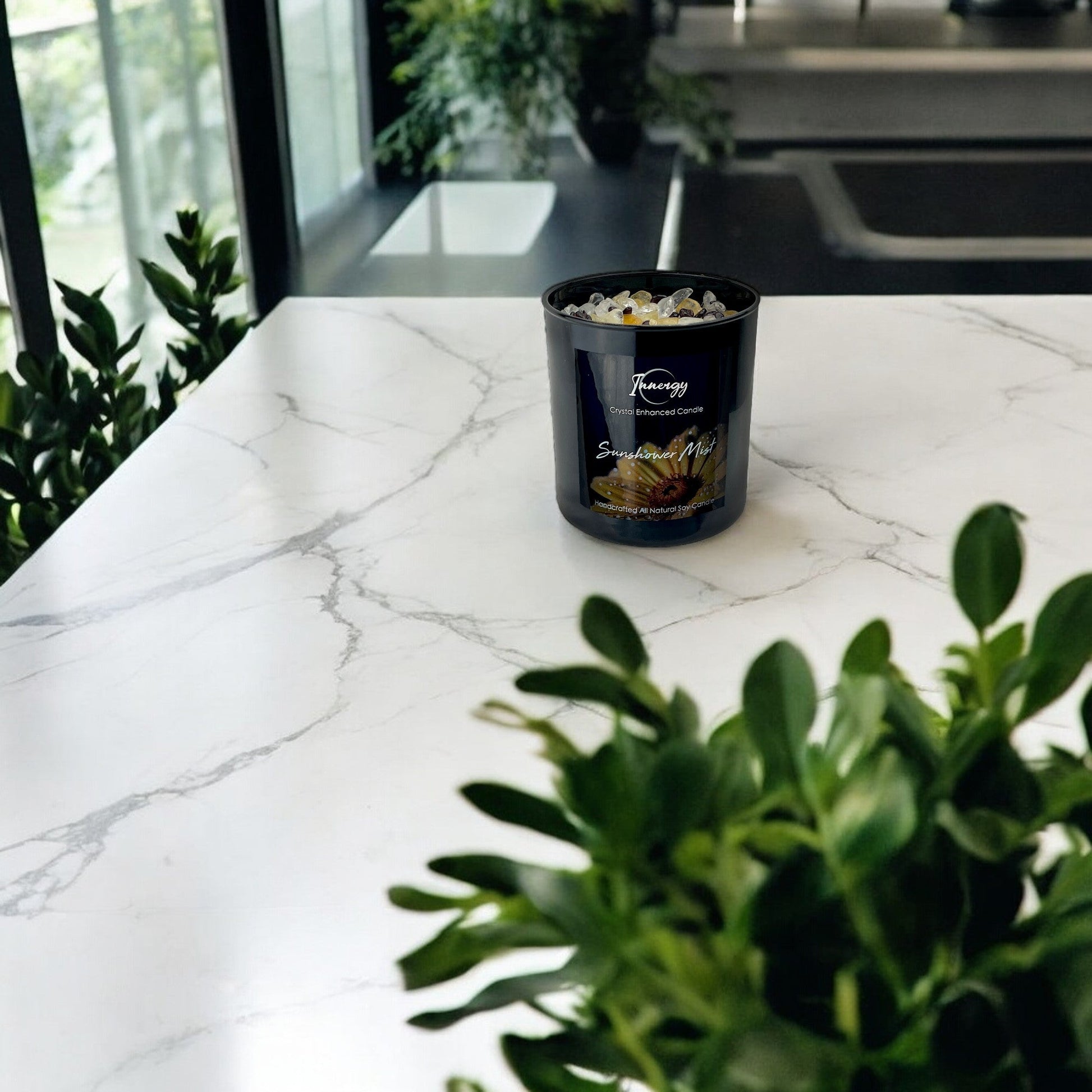 Experience the warmth and radiance of our Sunshower Mist Crystal Candle, a creation reflecting boldness and charisma. This candle's scent is a radiant composition, artfully blending the fresh allure of lily and rose petals with the clean, invigorating touch of airy ozone, and the deep, grounding notes of sandalwood. This fragrance is meticulously curated to embody magnanimity and warmth, echoing the natural tendency to shine and inspire.