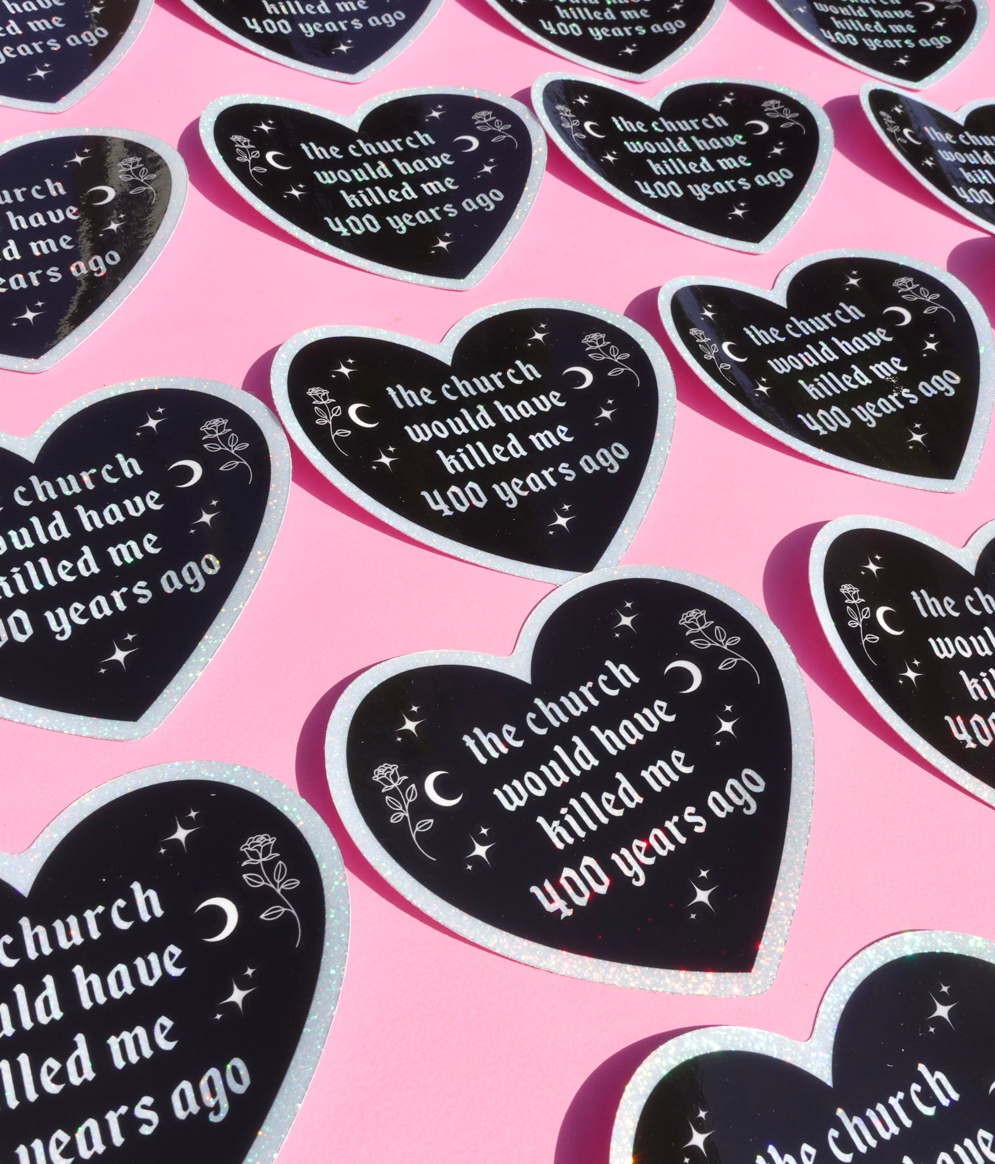 The “The Church Would Have Killed Me 400 Years Ago” sticker is a gothic heart-shaped vinyl decal with holographic sparkle and zero tolerance for patriarchal history lessons. Covered in stars, moons, and roses, it's perfect for your laptop, water bottle, spellbook, or emotional support journal.