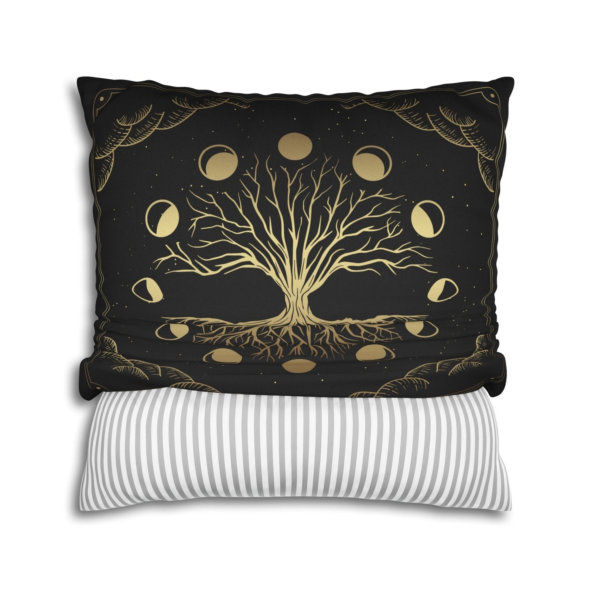 Immerse yourself in ancient symbolism with our “Tree of Life” Throw Pillow. Featuring a radiant gold illustration of the Tree of Life encircled by moon phases on a rich black background, this pillow blends the cosmic and the earthly. Perfect for witchy and dark boho decor, it adds sophistication and depth to any space, inviting contemplation and conversation. Add it to your home and let it be a daily reminder of the universe’s beauty and complexity.