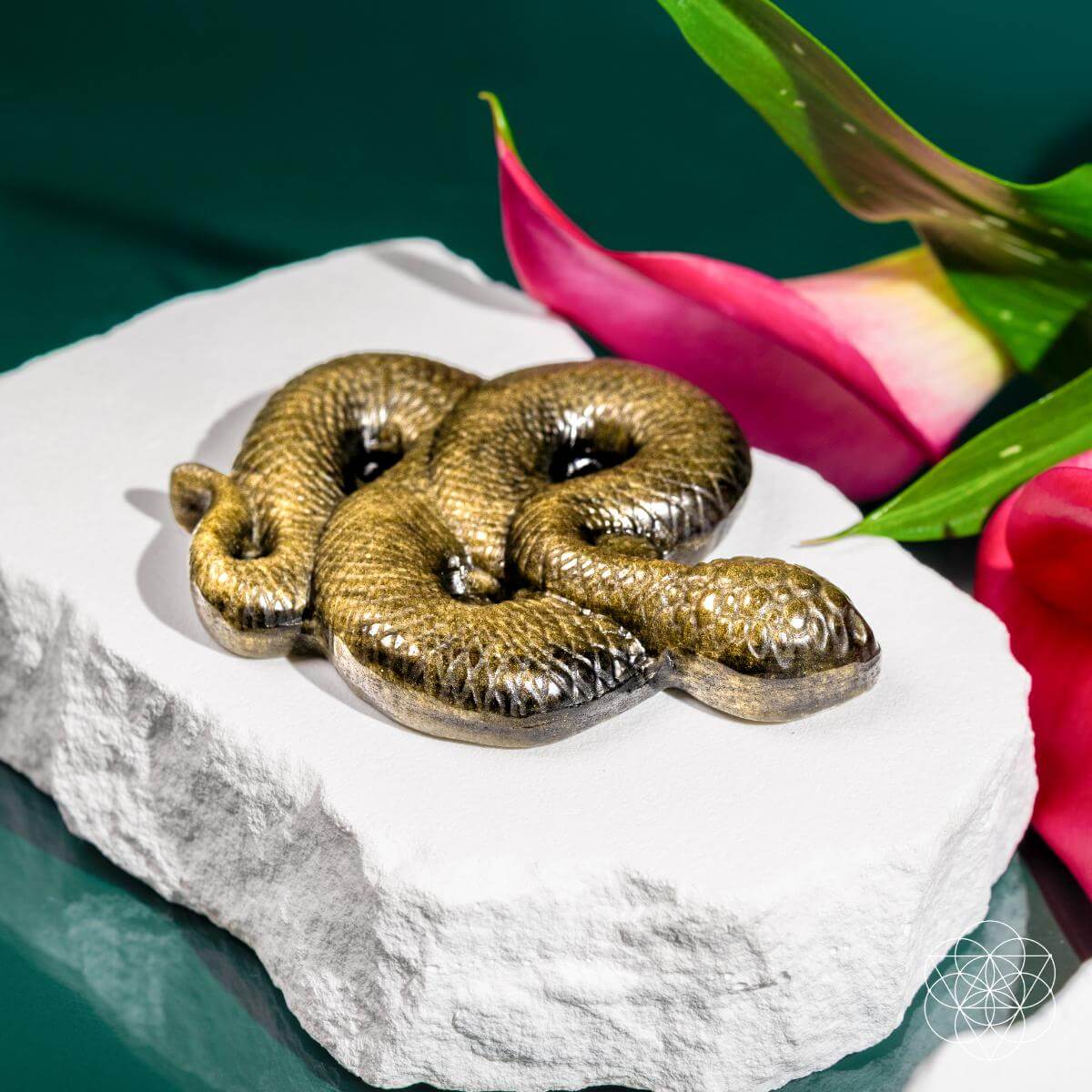 The Serpent is ancient power incarnate—coiled, aware, and untamable. A symbol of the Divine Feminine, the snake doesn’t chase. She transforms. Feared for centuries because she cannot be controlled. Her energy is wisdom, protection, rebirth, and primal truth.