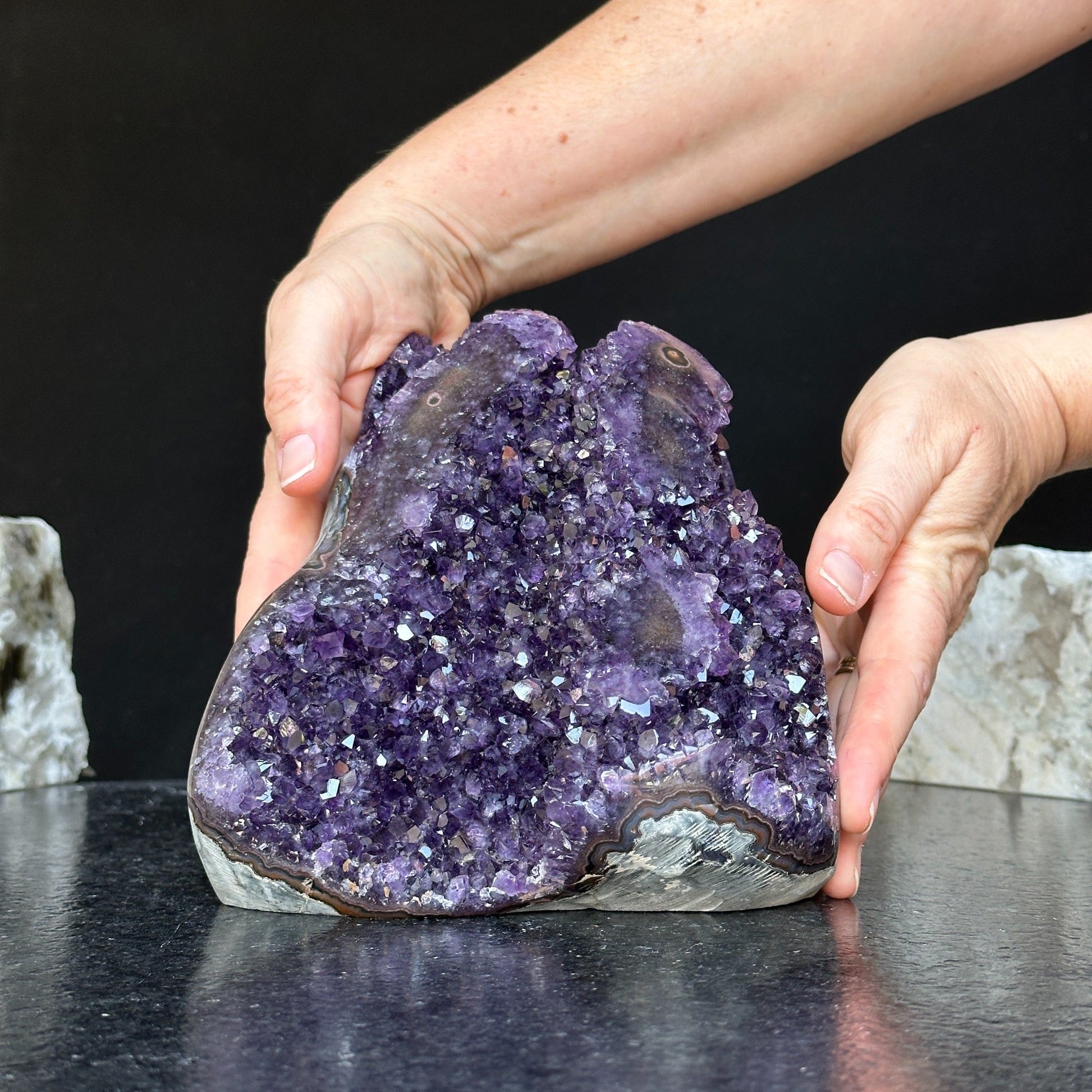 This incredible amethyst geode has a unique shape, stalactite formations and agate edges in shades of brown. This specimen is gorgeous from any angle, perfect for displaying in an entry table or library. It will look great from any location in the room.