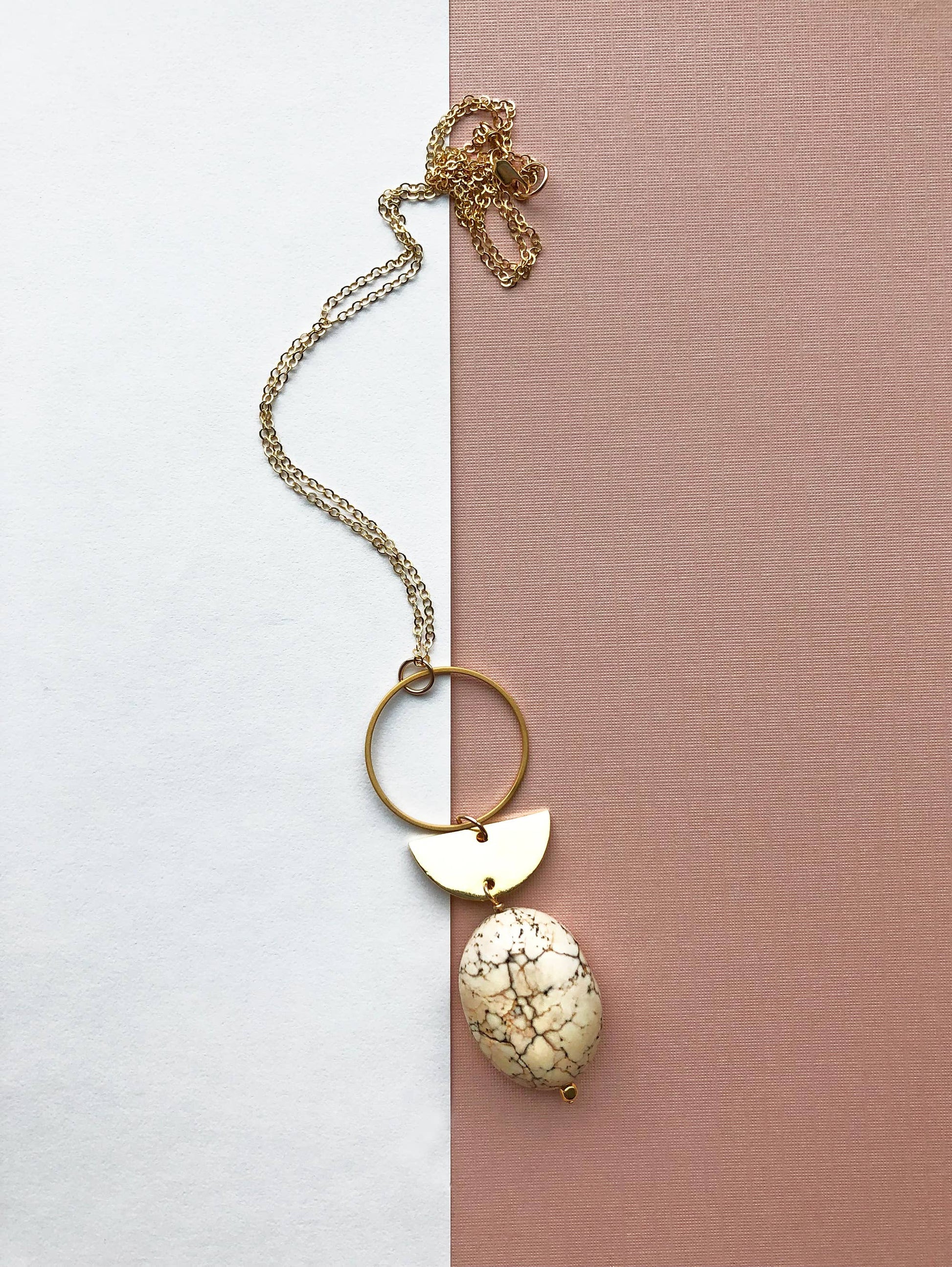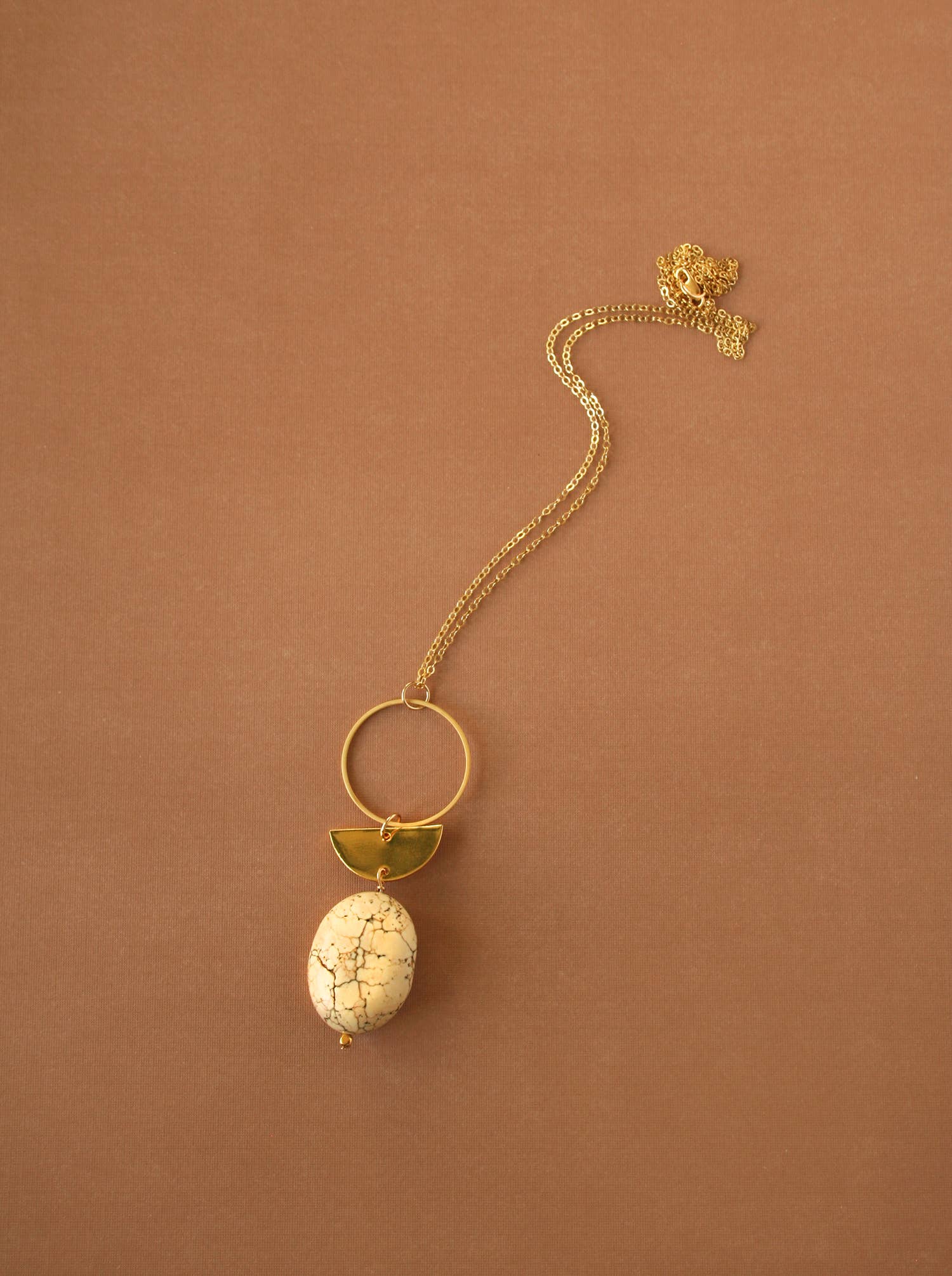 A large stone of white turquoise is paired with geometric gold shapes for a go-to statement necklace. Great on its own or layered with a scarf or shorter necklace.