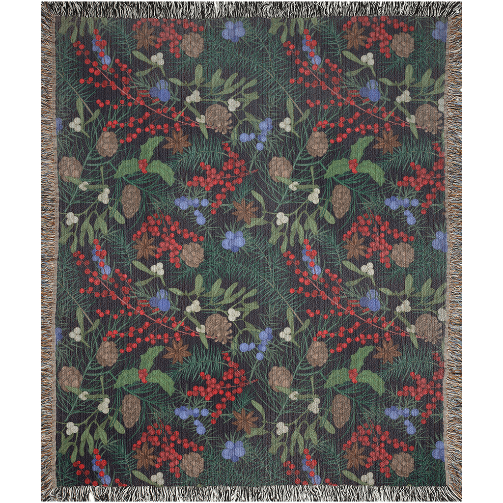 Winter Plant Woven Blanket With Pinecones, Winterberry, Fern Stems. Botanical Home Decor.