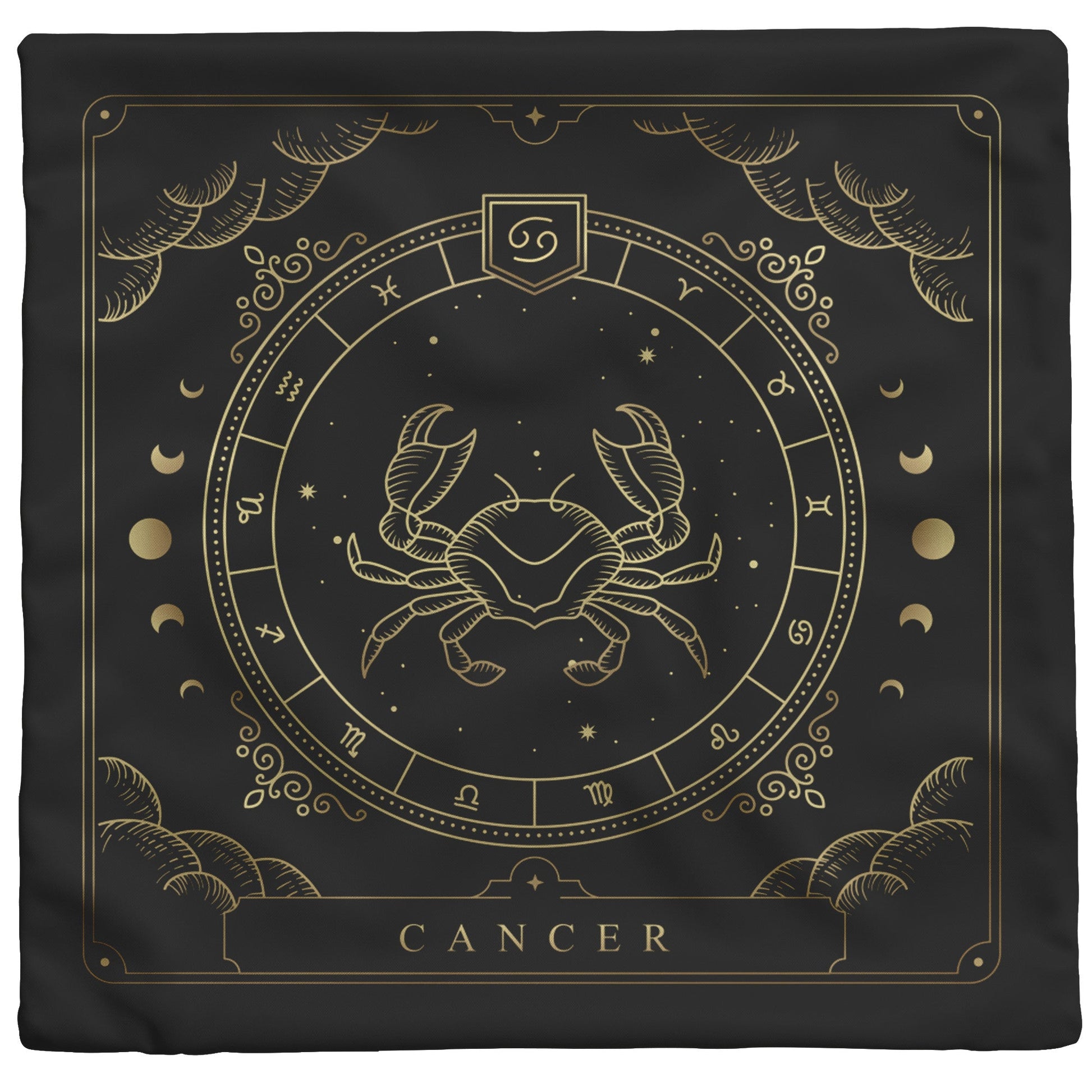 Create a cozy and inviting atmosphere with this lovely and soft throw pillow. This pillow features the zodiac symbol of Cancer, the crab, in a tarot-inspired design in gold artwork on a black background.