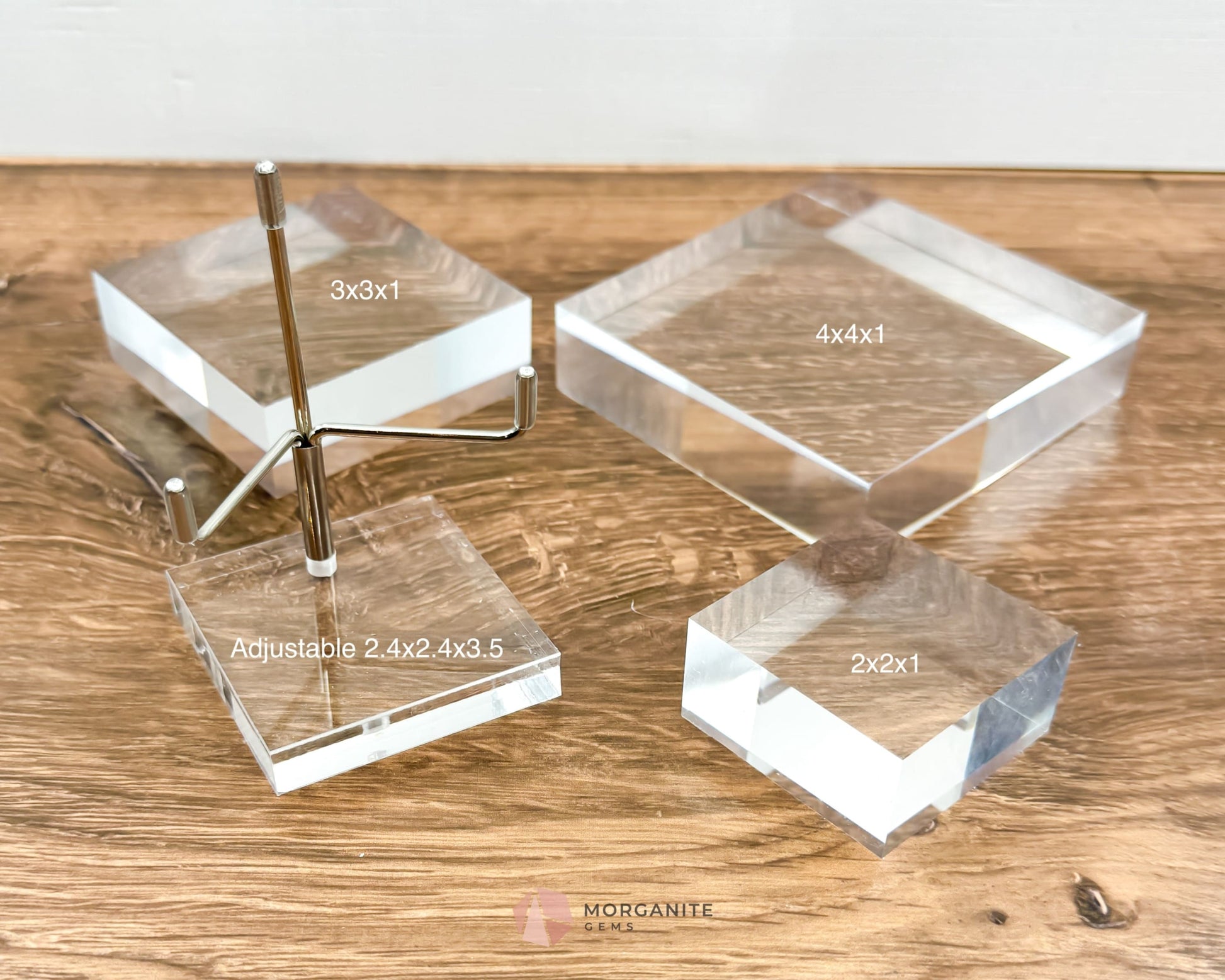 Acrylic Medium: 3 x 3 x 1 Perfect for showcasing medium-sized rocks or creating a balanced arrangement, our medium stands strike the ideal balance between presence and versatility. Medium acrylic base comes with museum putty to secure specimen in place.