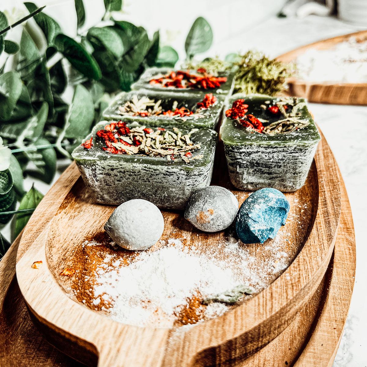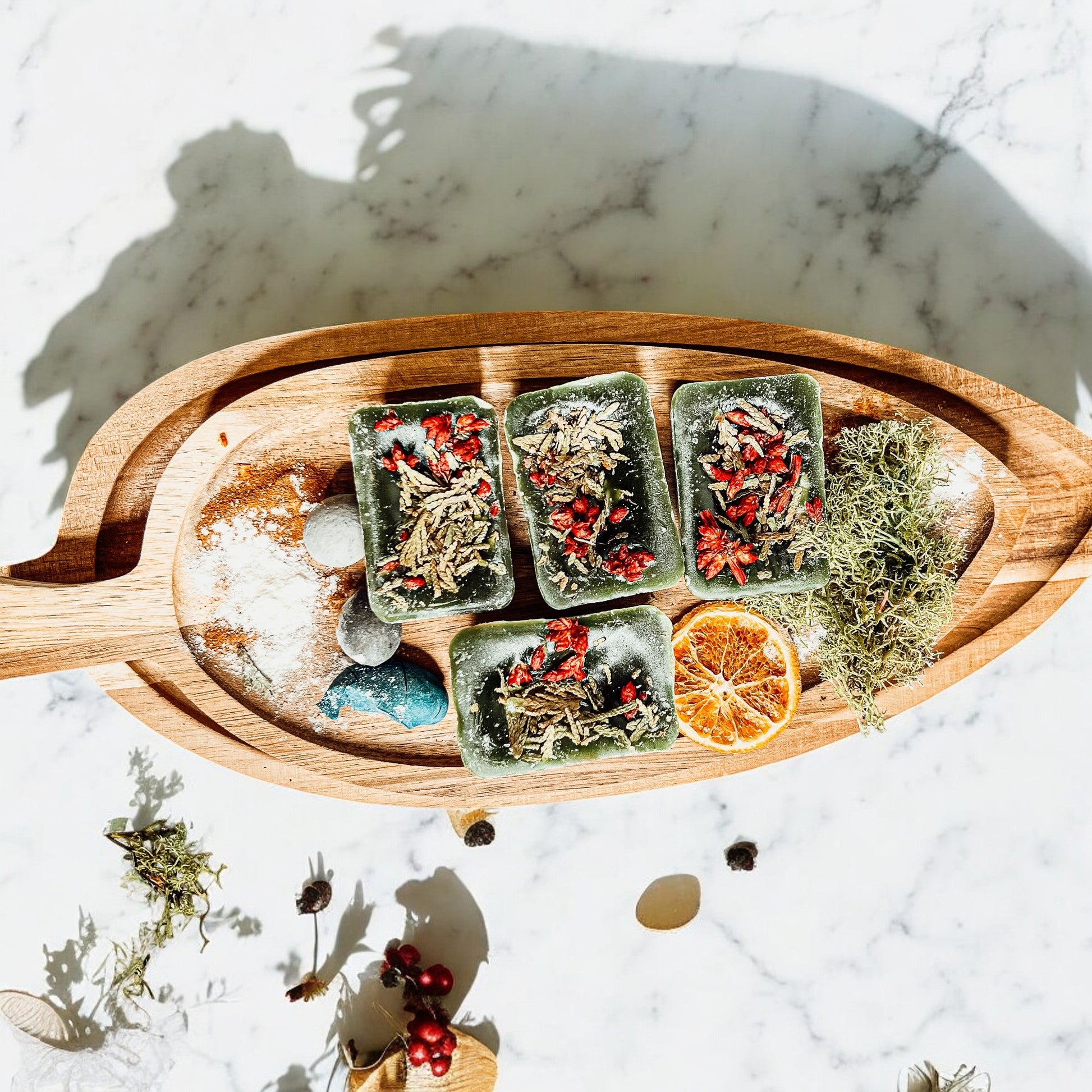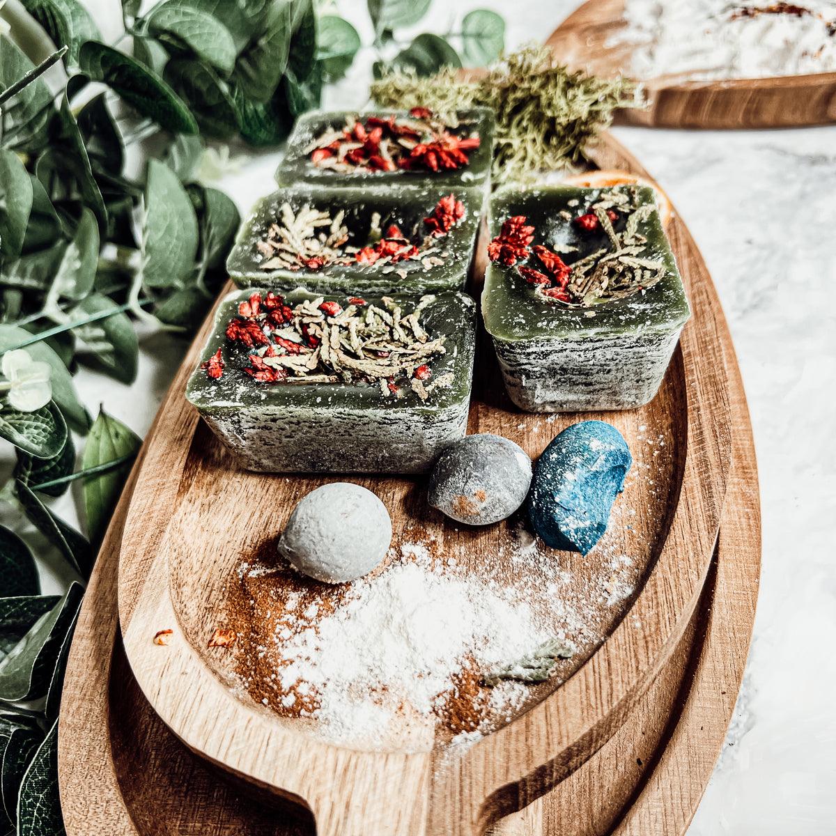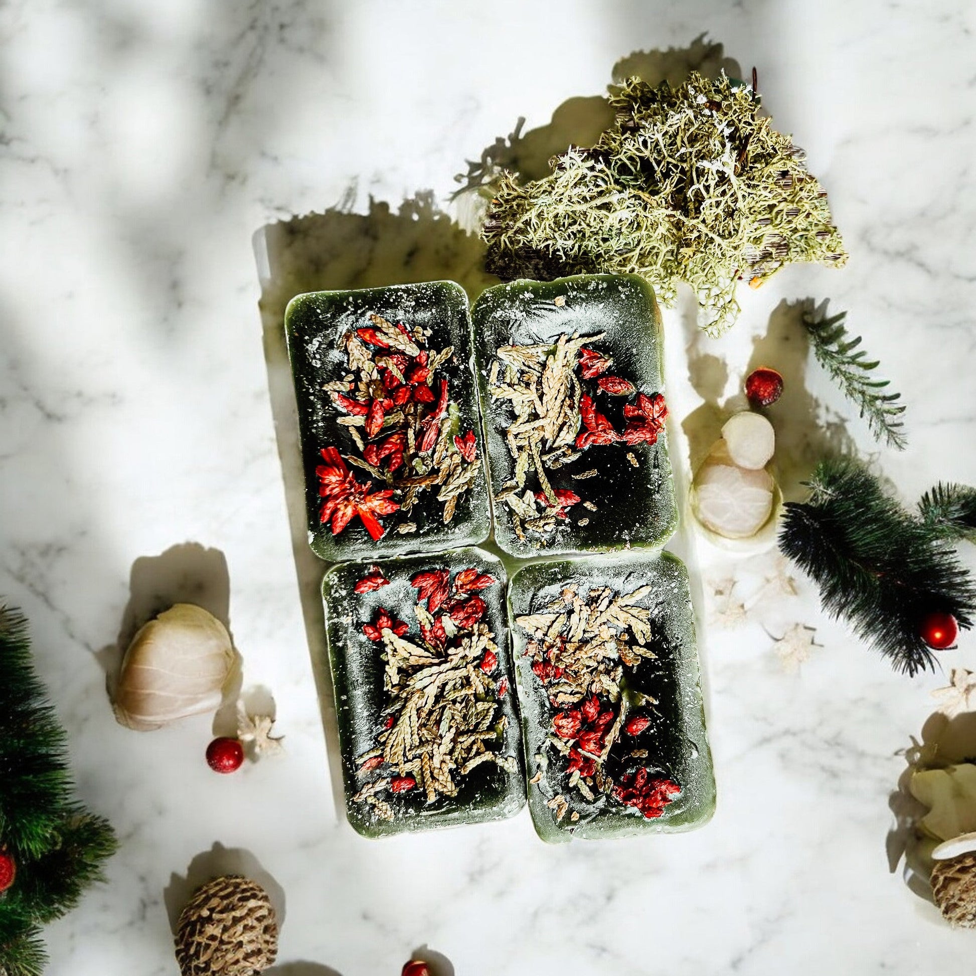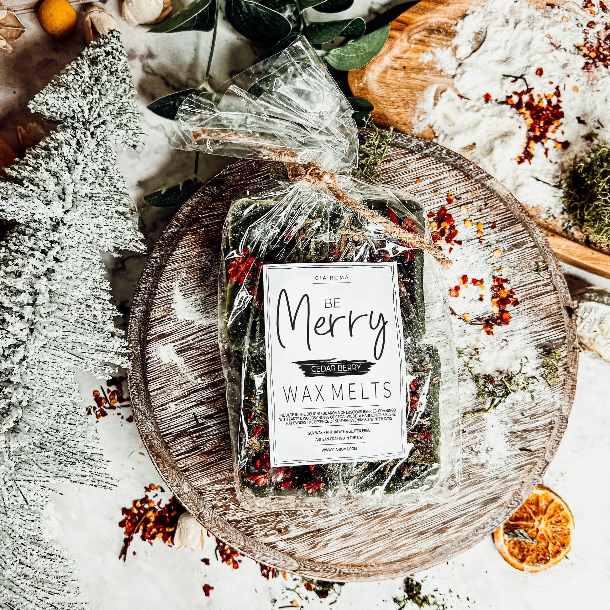 A combo of Cranberry Sugar, Wood Cabin + Prairie Blossoms. Topped off w/ fresh cedar tips and botanical goodies.