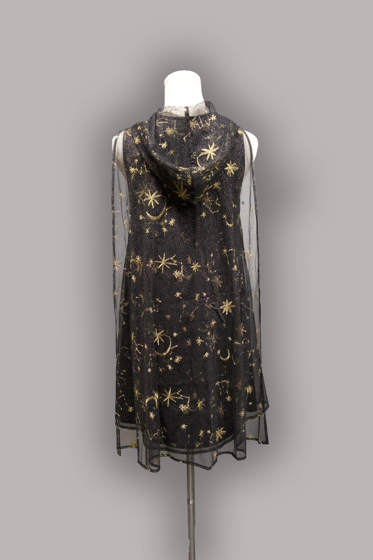 This 60s style A-line mini tent dress features embroidered celestial fabric, a sheer attached capelet and hood, plus a keyhole closure at the neckline.