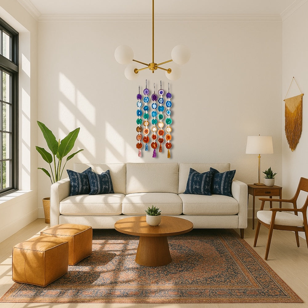 Introducing the Chakra Harmony Agate Garland Wall Hanging, a handcrafted masterpiece designed to infuse your home with harmony and positive energy. This exquisite wall hanging features seven vibrant agate slices, each representing the colors of the chakras, meticulously selected to bring balance and serenity to your space.