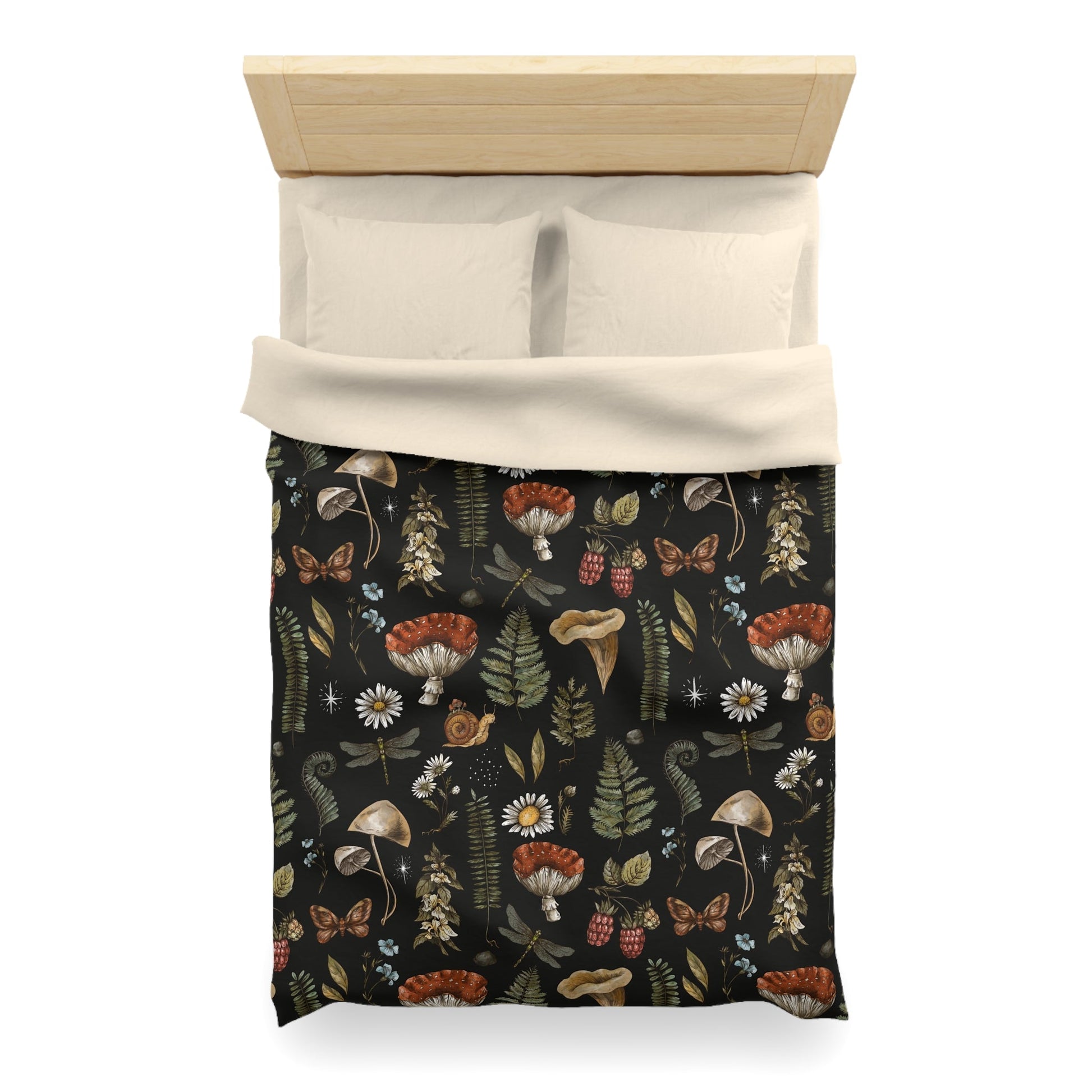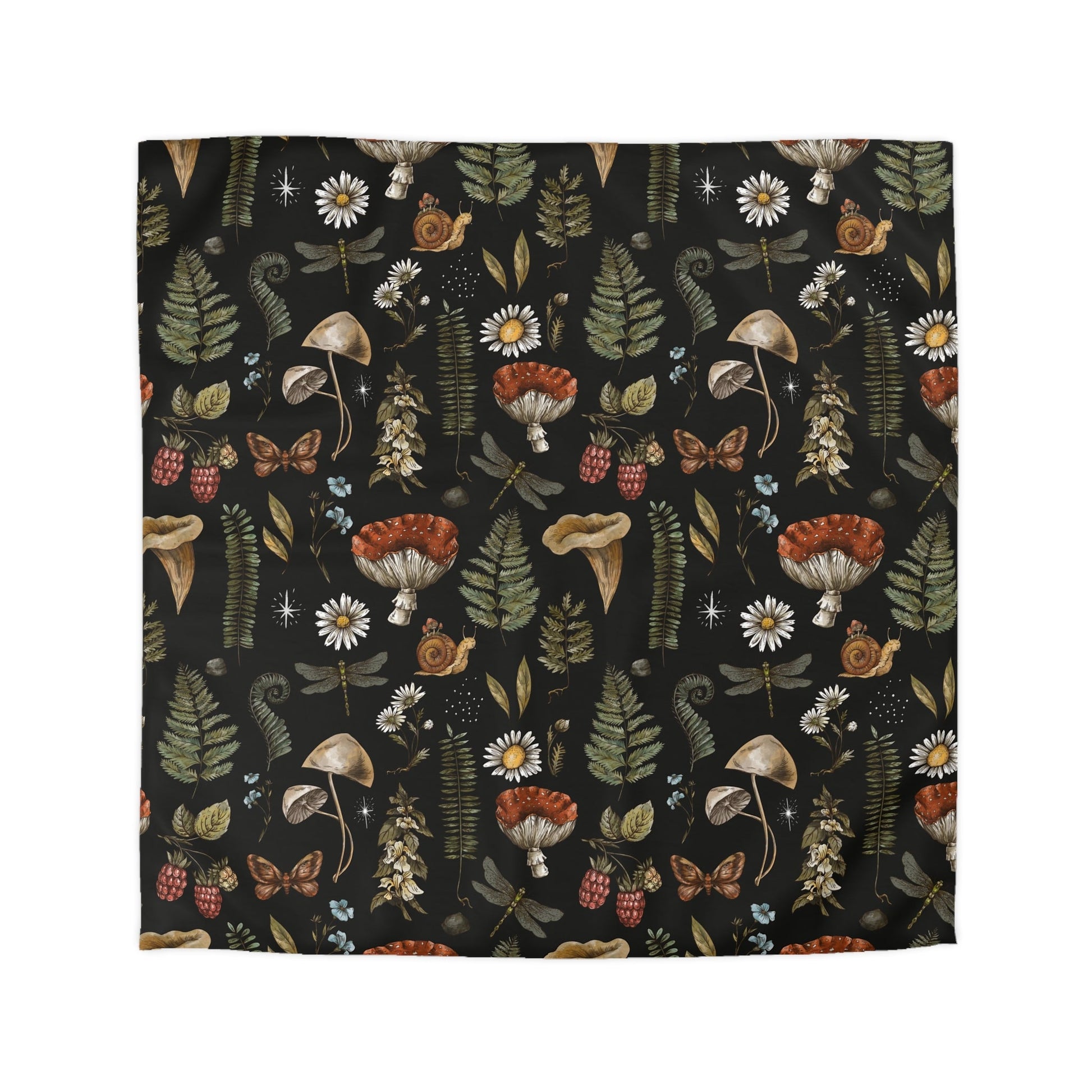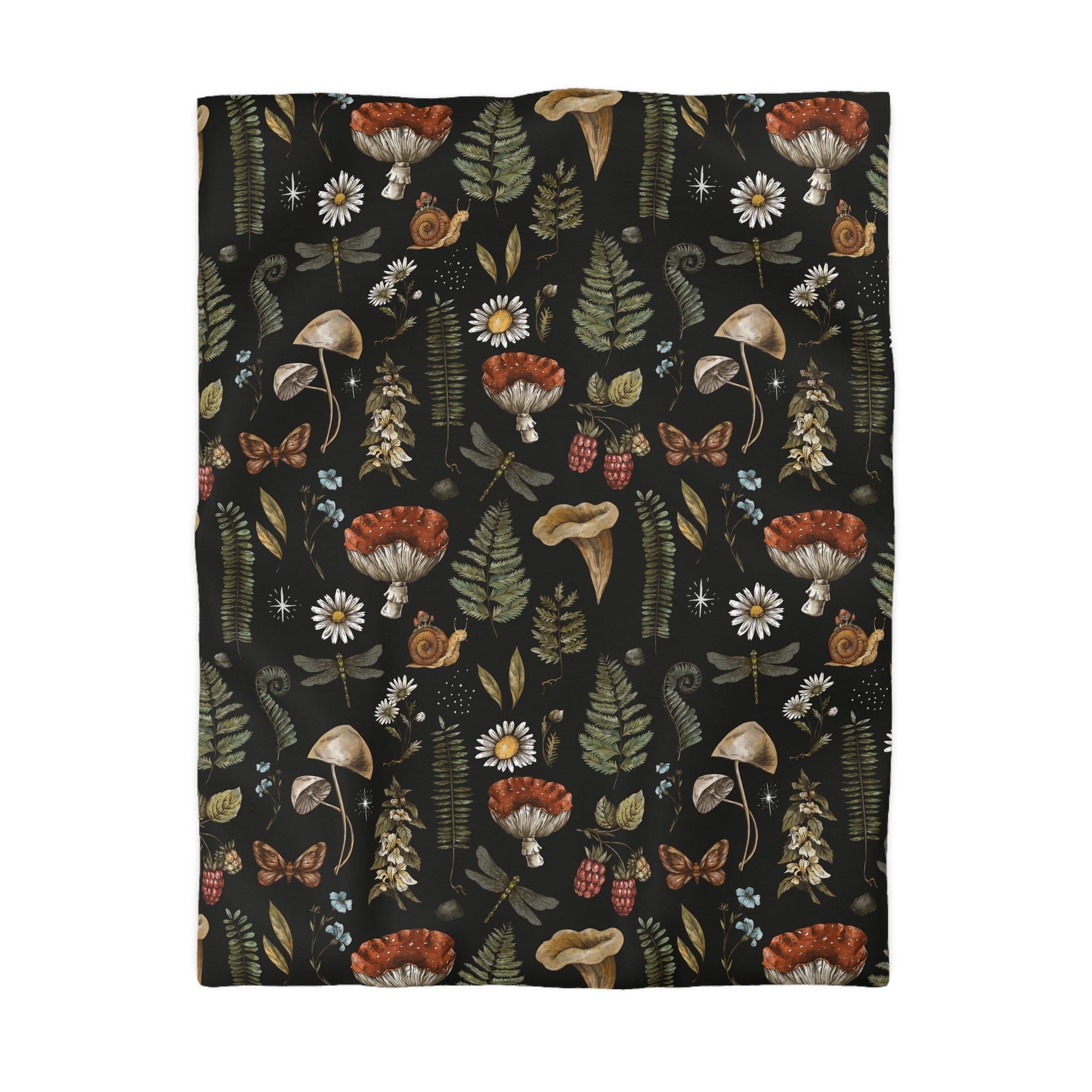 Create a cozy and mysterious ambiance in your bedroom with this duvet cover. This duvet cover features a dark forest themed pattern of flora and fauna found on the forest floor on a black background. The duvet cover is made of 100% polyester microfiber, which is soft, durable, and wrinkle-resistant. It has a zipper closure at the bottom that makes it easy to insert and remove your duvet, and gives it a seamless and elegant look.