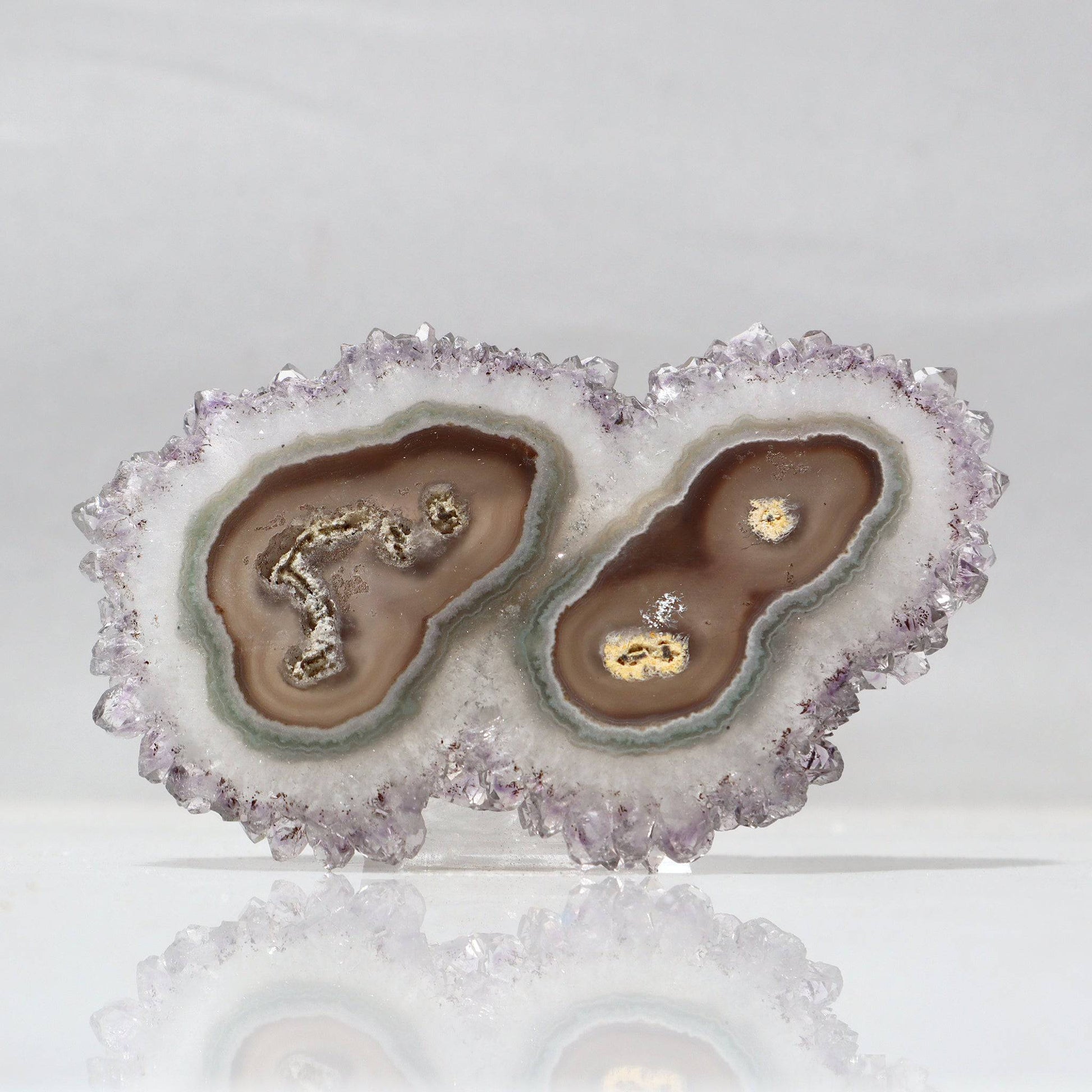 This triple-center stalactite of green agate slice bears a resemblance to a lively caterpillar, unveiling a triple center composed of delicate green agate, bordered by lilac crystal peaks. It represents a complete and harmonious mineral balance, showcasing its innate beauty.