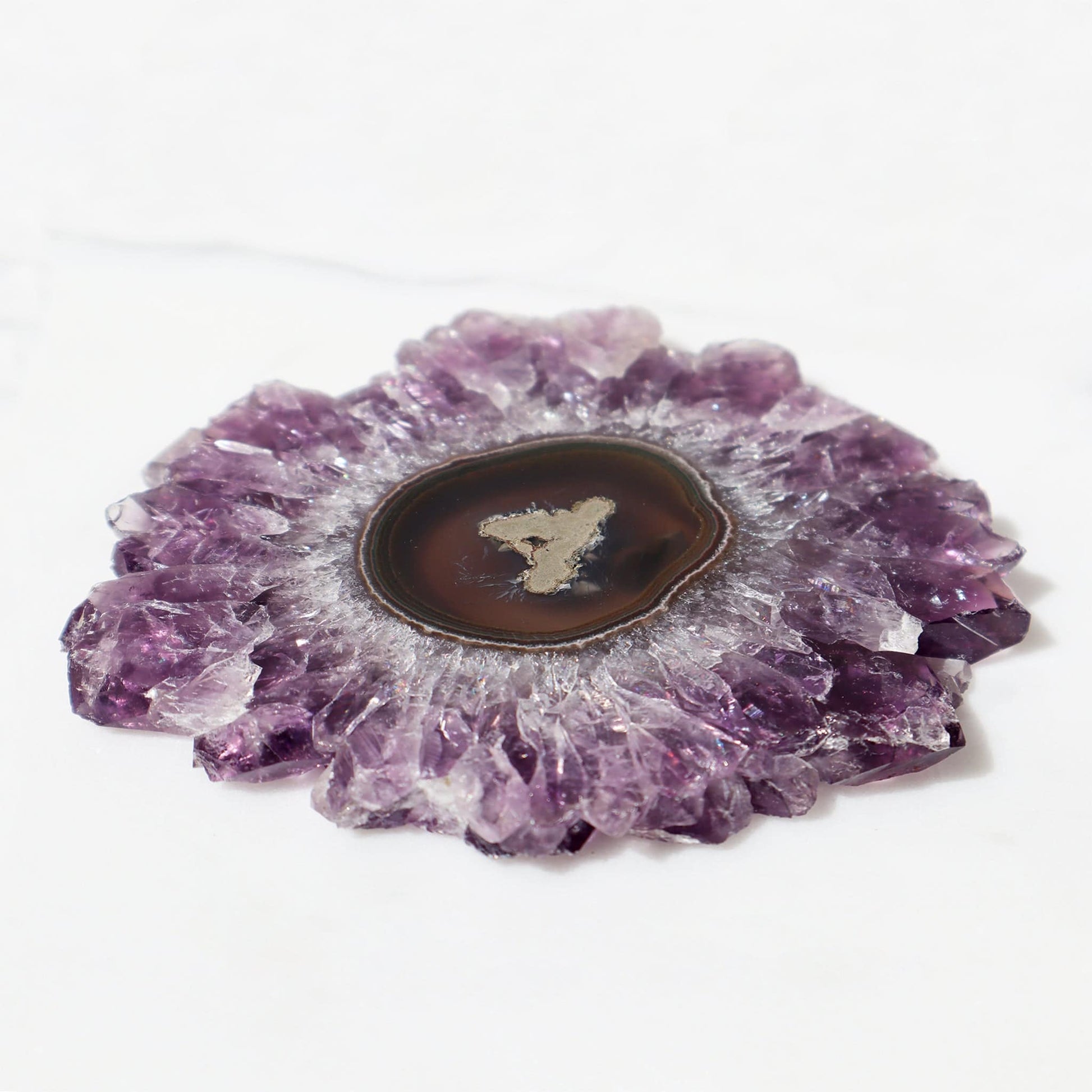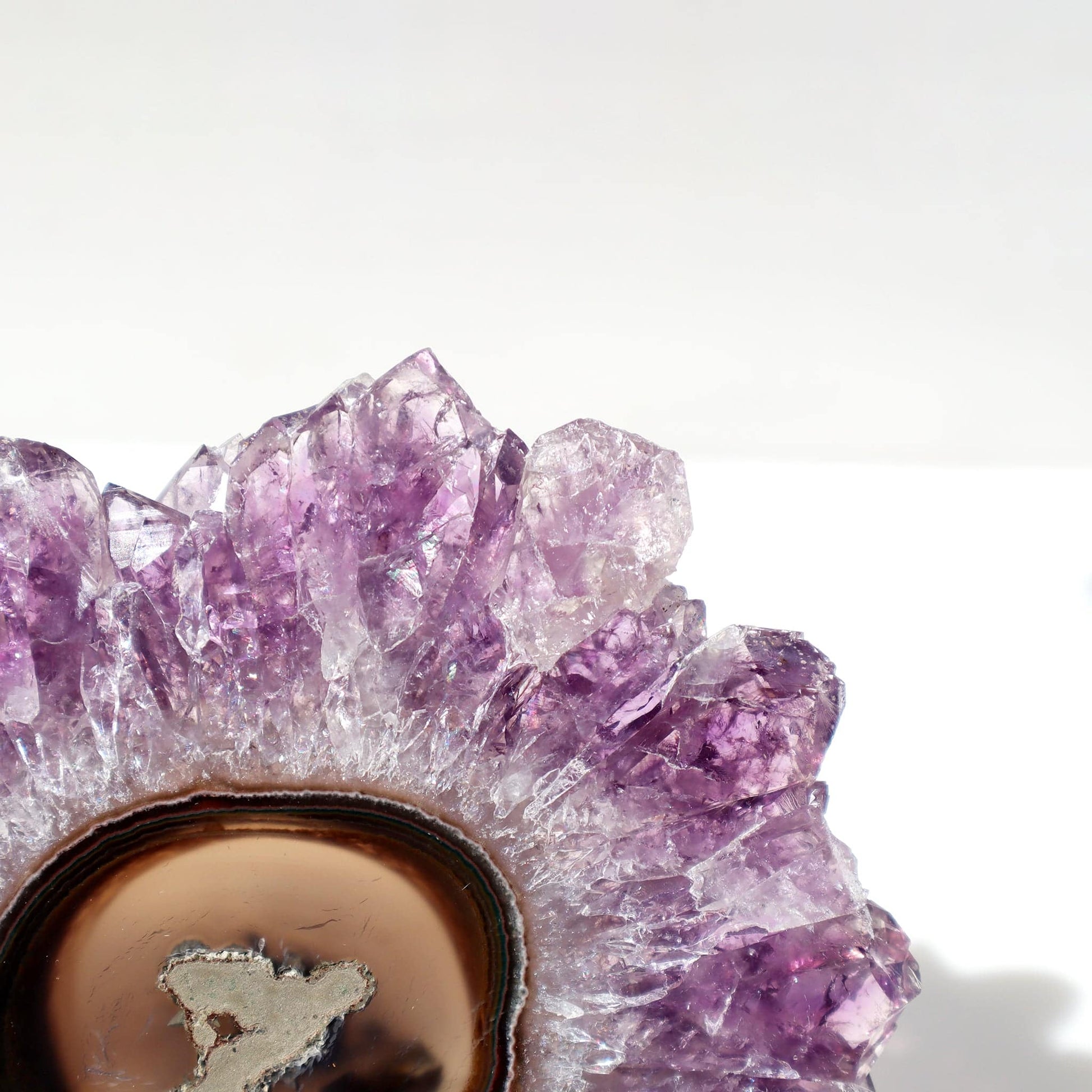 Experience the unparalleled class and elegance that only Uruguay can provide with this timeless and sophisticated amethyst crystal agate flower stalactite slice. Adorned with exquisitely large and sharply defined crystal peaks of the utmost quality, it exudes an air of refinement.