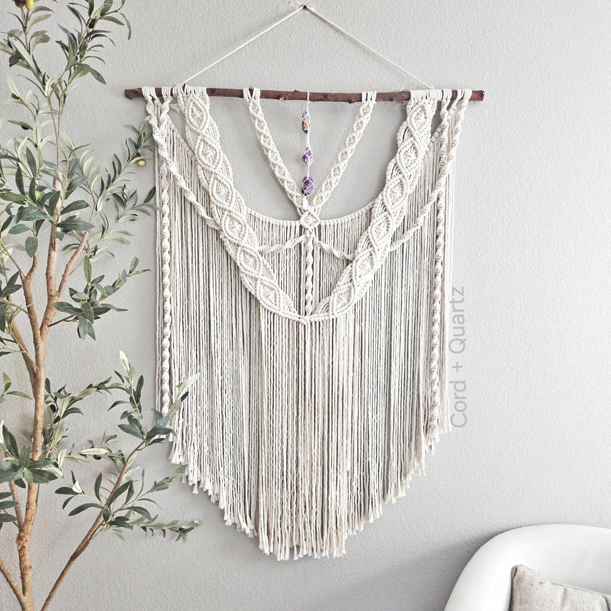 Level up your home this year with this one of a kind handmade extra large macrame wall hanging with 3 amethyst crystals.