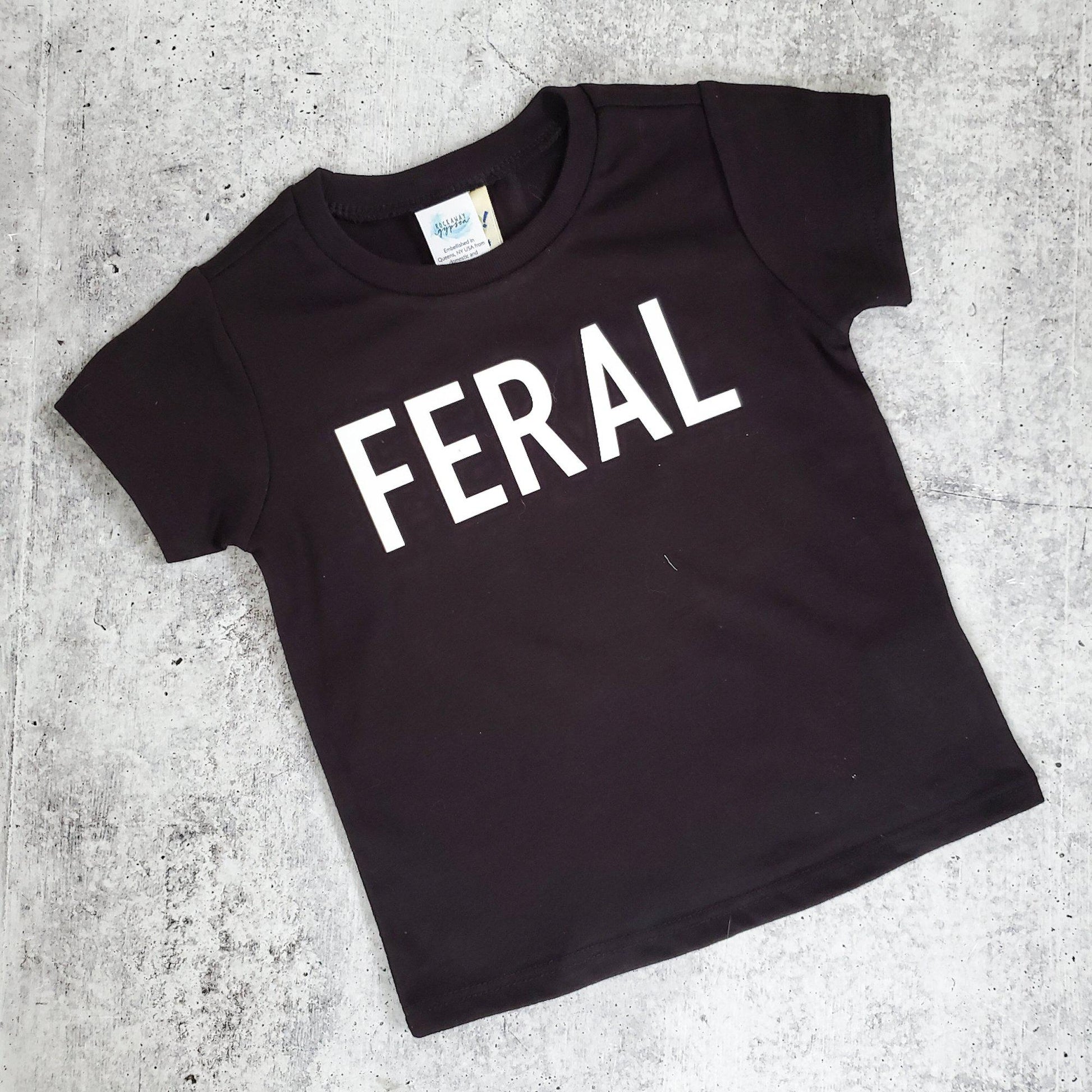 This unisex t-shirt or baby bodysuit says FERAL in simple block letters.