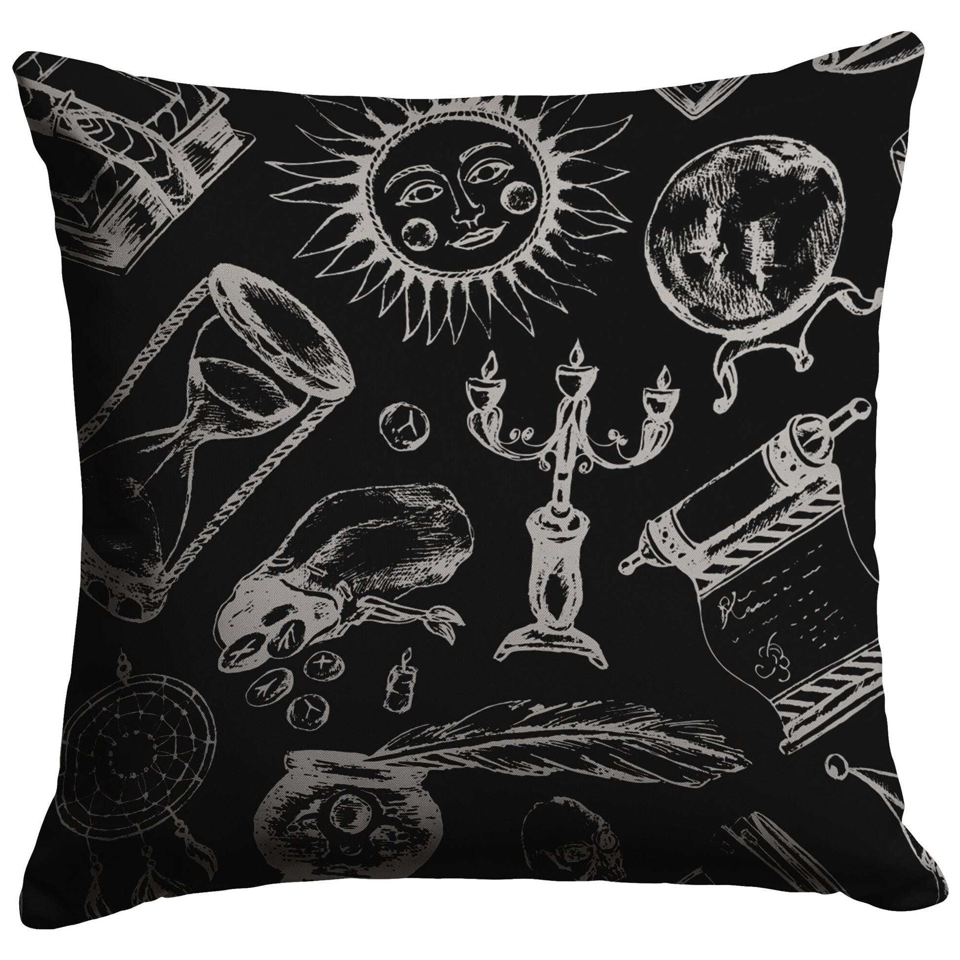 Step into the mystical realm with our “Fortune Teller” Throw Pillow, adorned with hand-drawn illustrations of candles, scrolls, spell books, crystal balls, writing quills, divination runes, dreamcatchers, and the sun.