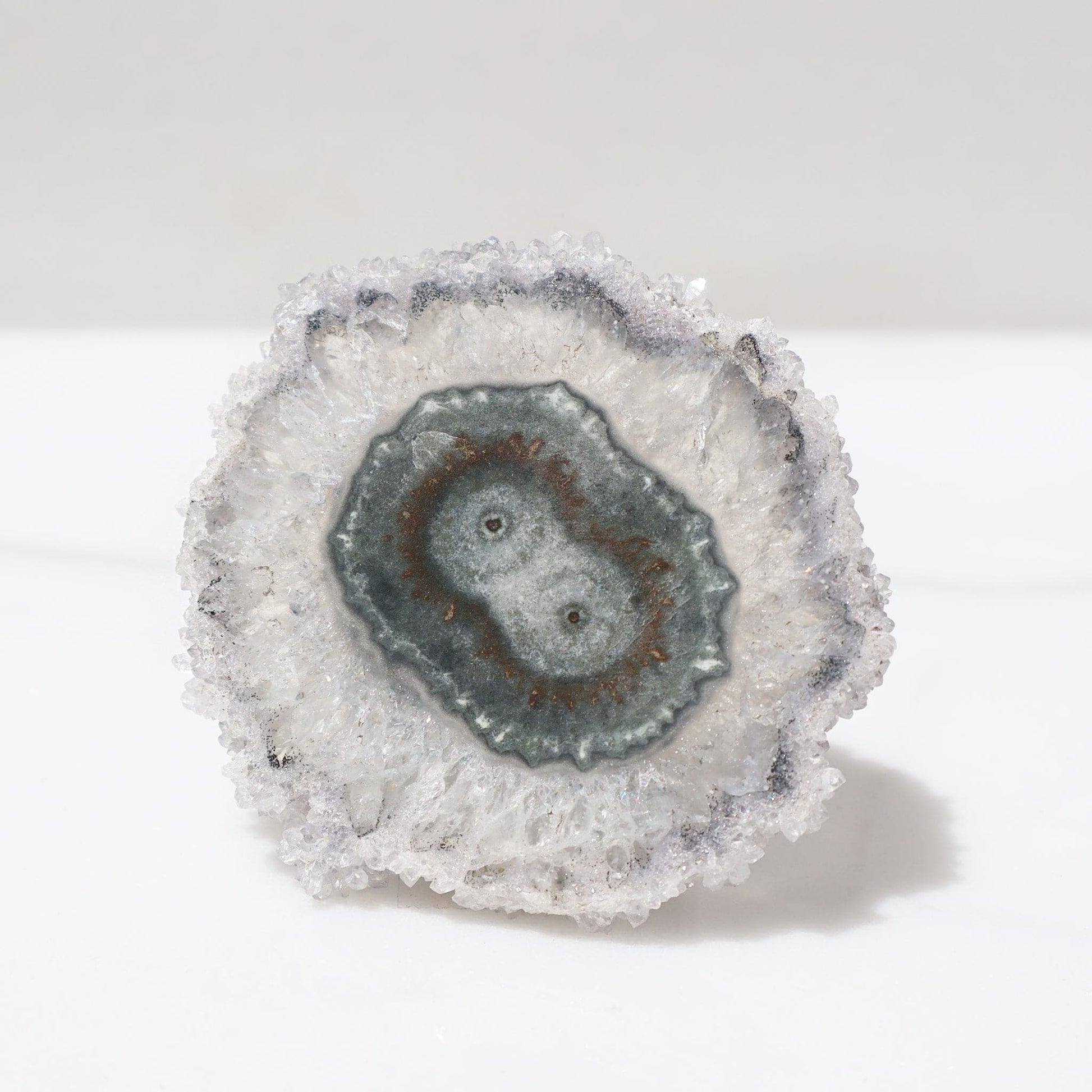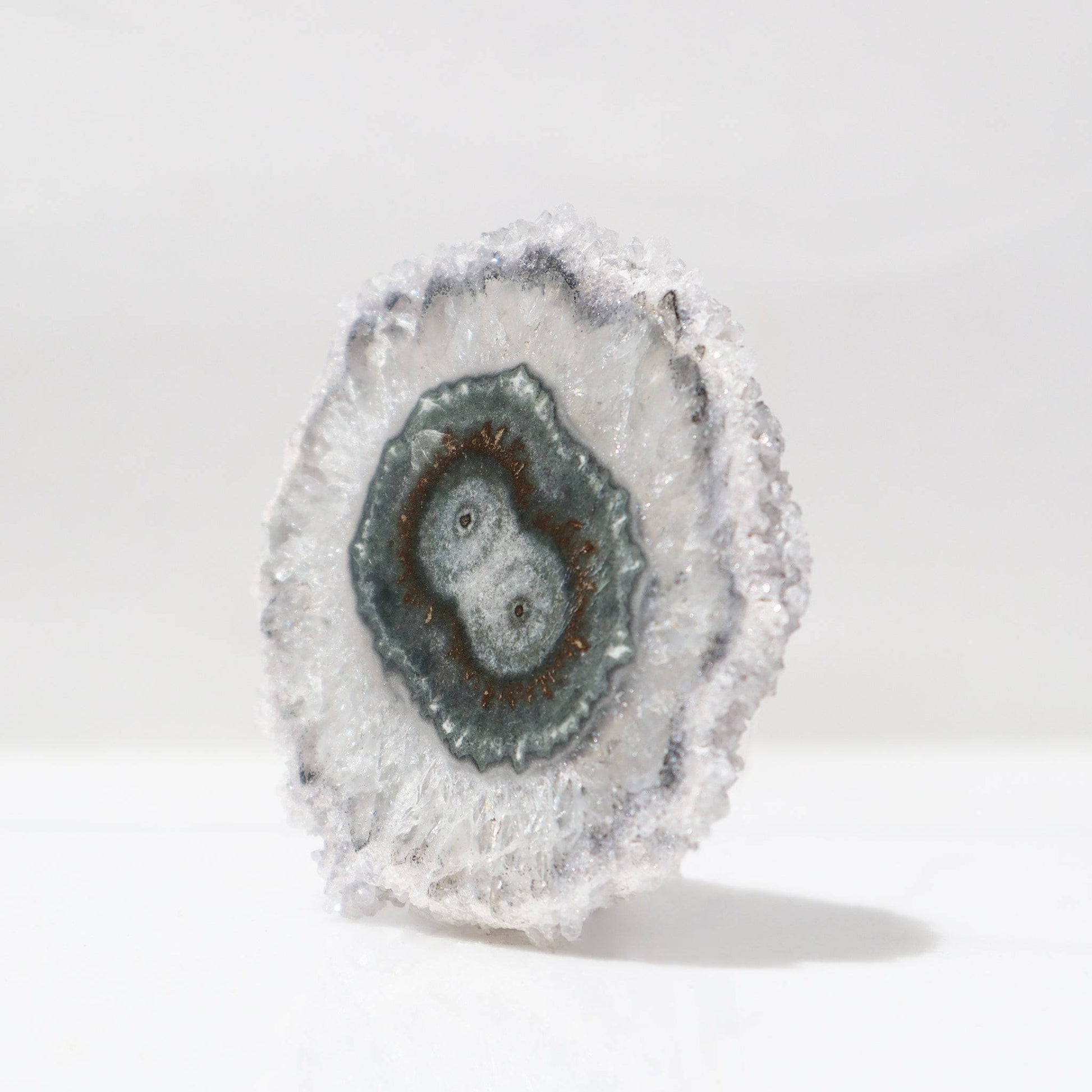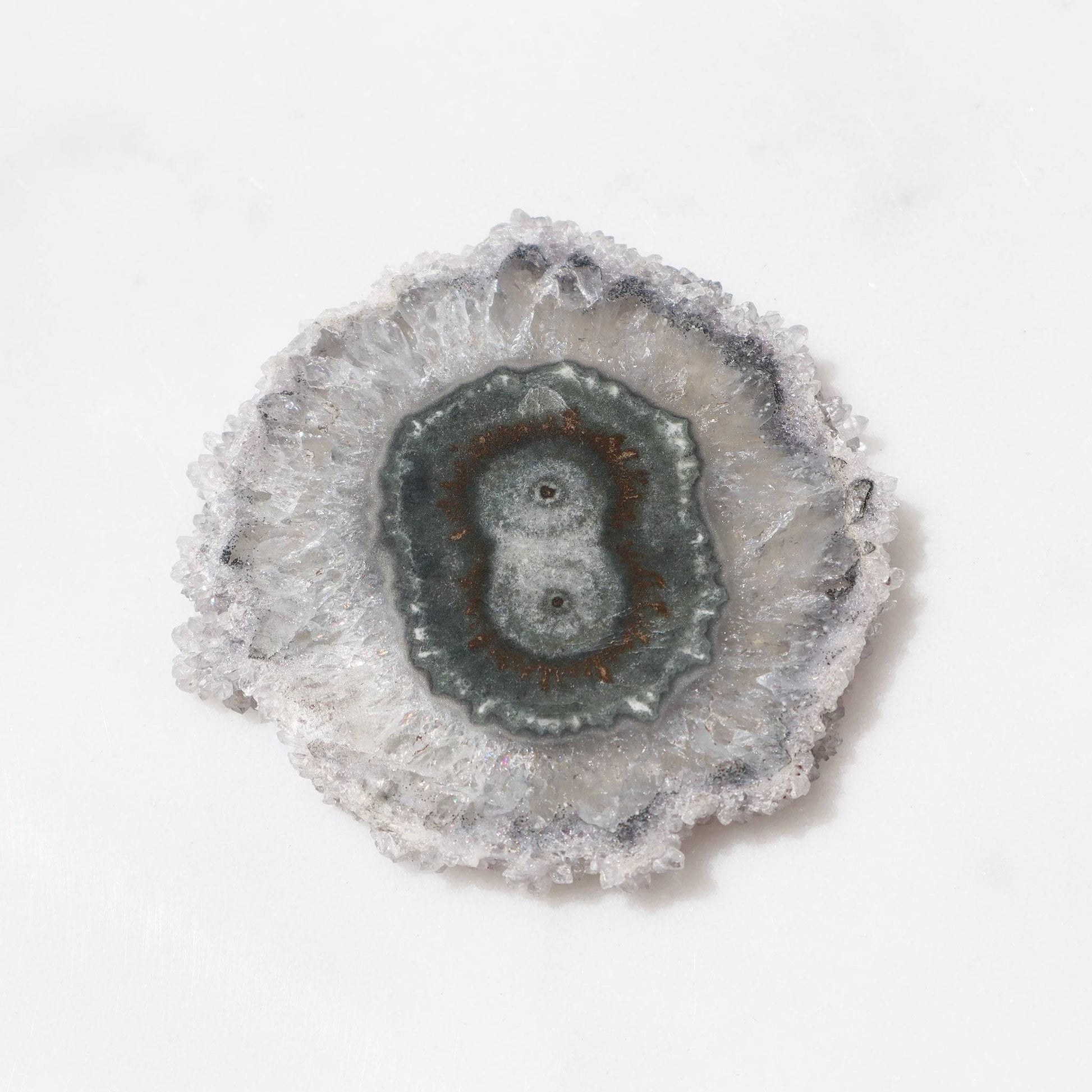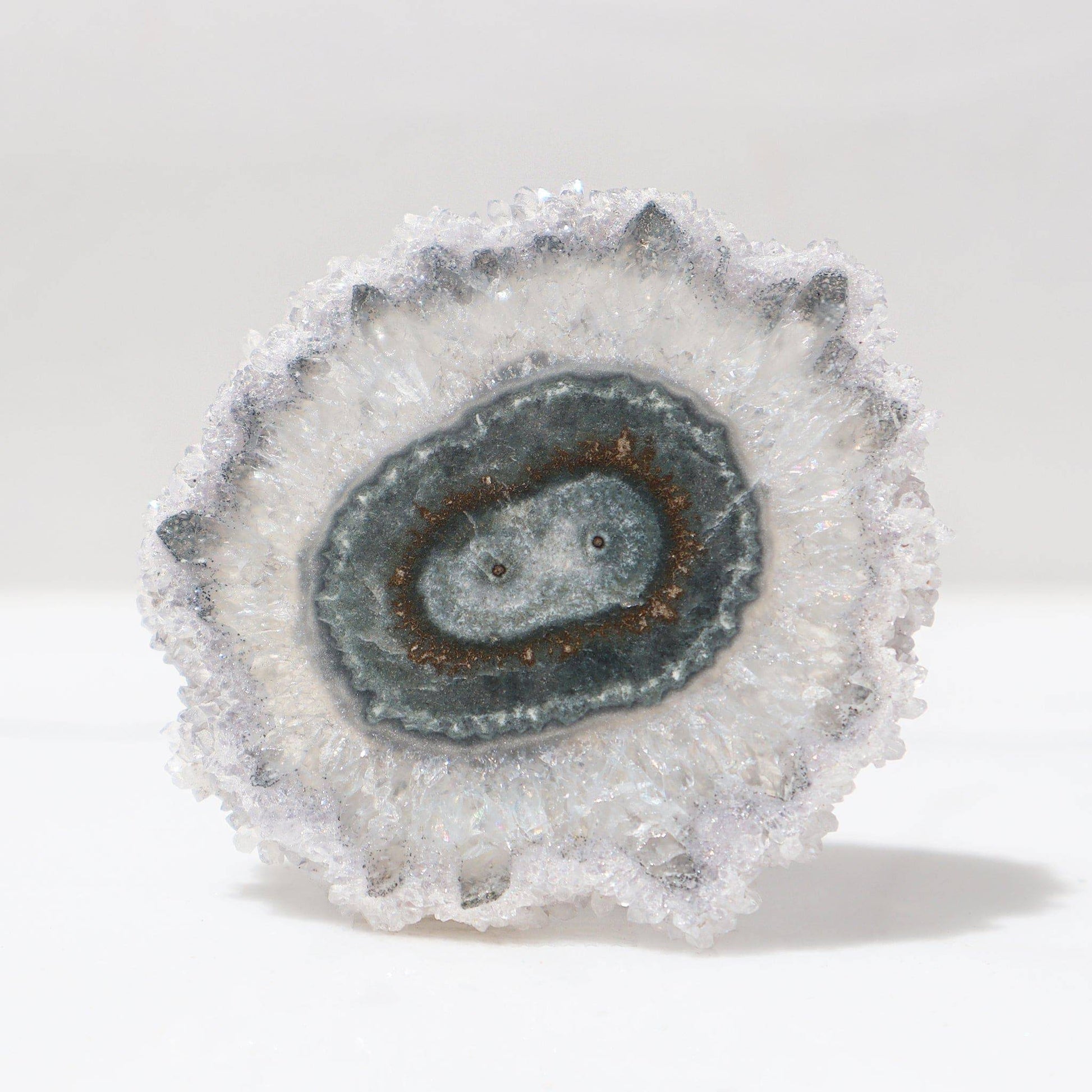 Geologically speaking, amethyst stalactites can be found only in a few areas across the world. This Uruguayan amethyst slice differs from the more traditional purple hues to delight us with a lovely oval green-blue agate double center. Outlined with green on the edges of the crystals, it is of calming beauty.
