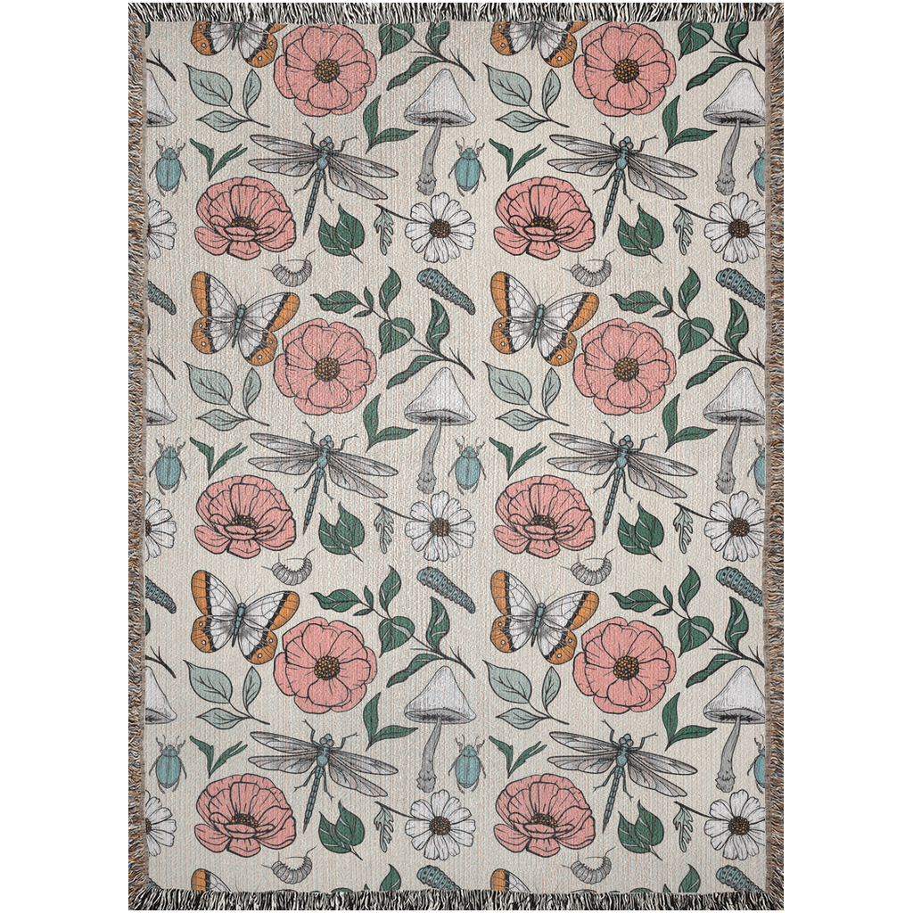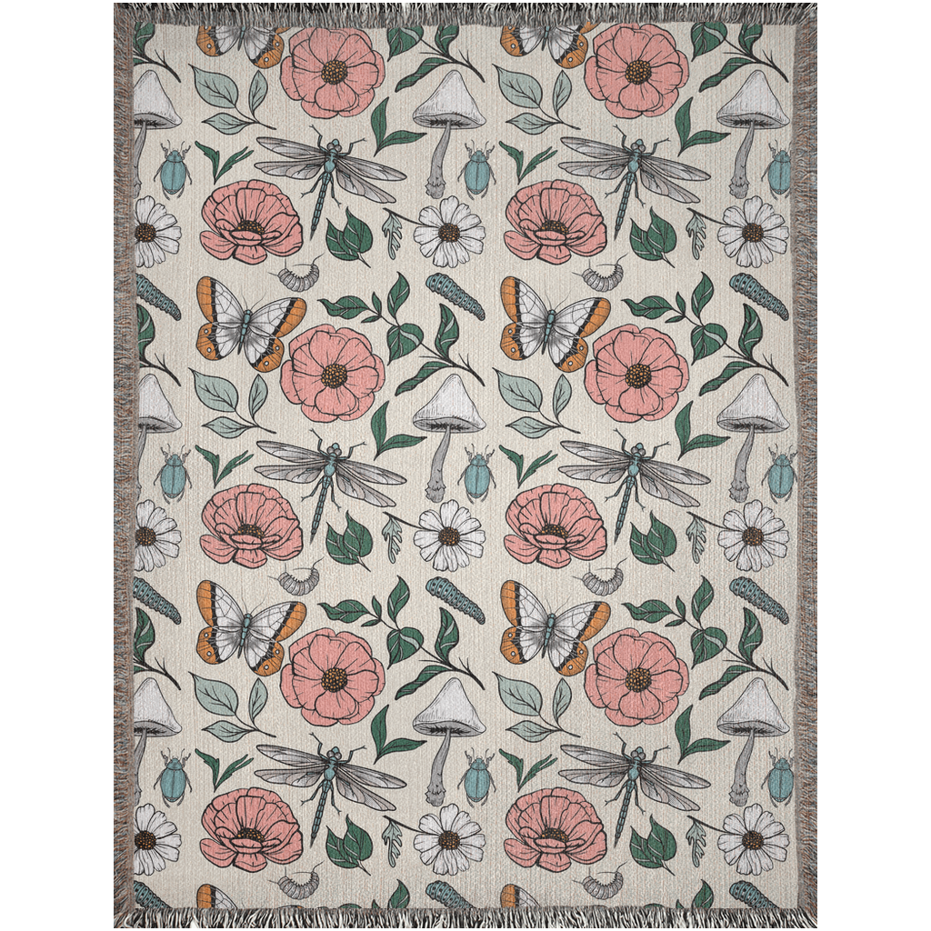 Insects and flowers woven blanket. Pink Flowers, Green Leaves Plants, White Mushrooms and Insects. Cute Mothers Day gift.