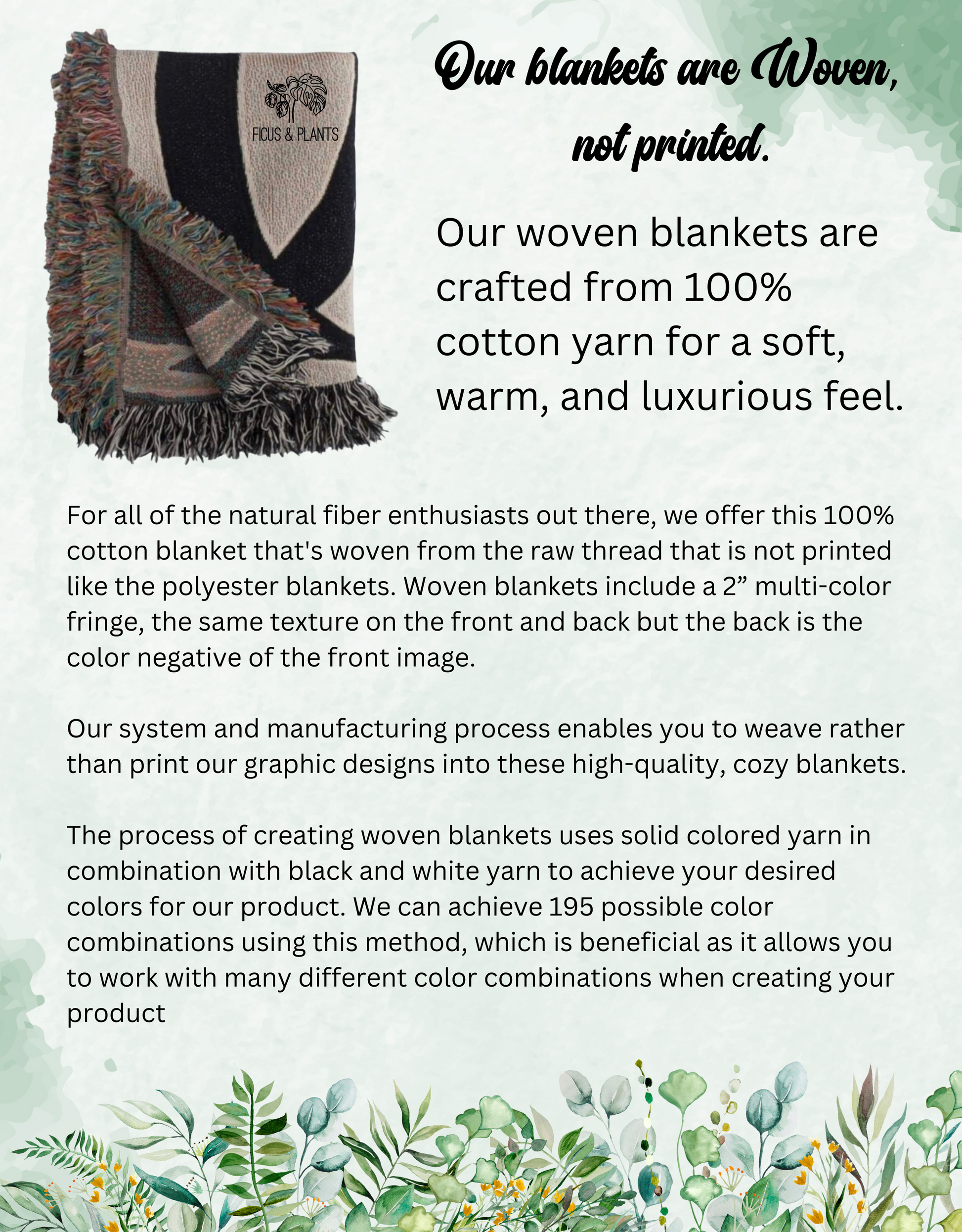 This soft woven blanket is not only comfortable but versatile. Use it as a wall decoration, a throw for your sofa, or even a picnic spread the possibilities are endless. Each blanket is made of 100% pure cotton that is dyed in colors to bring your unique image to life. Crafted with an intricate woven production process, rather than a printed technique, our blanket creates a distinctive, more luxurious custom product. This durable, warm blanket wth colorful fringed edges is the perfect canvas for your creative designs, graphics or photography.