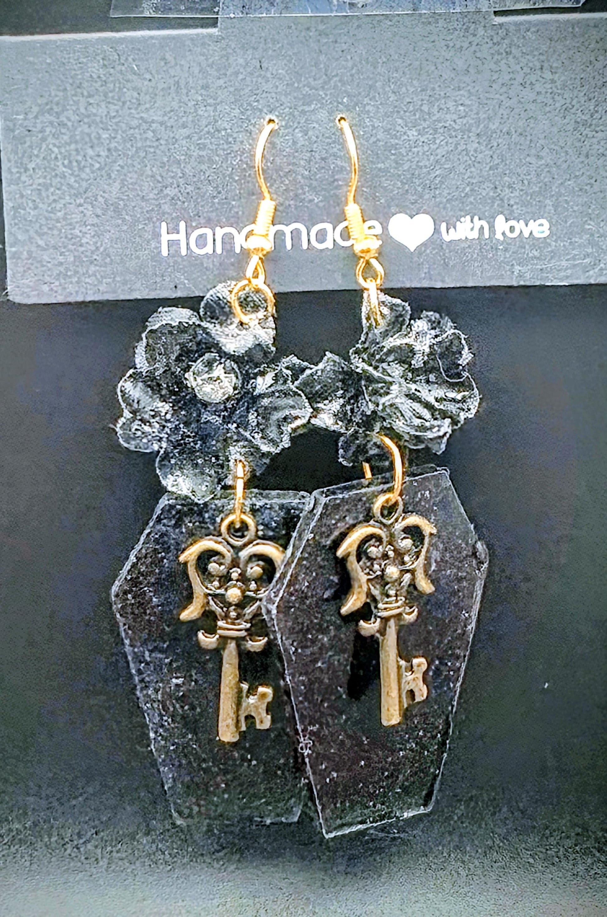 Unlock a little dark romance with these striking handmade dangle earrings. Combining classic gothic elements with a unique layered design, they are the perfect statement piece for any spooky season, Goth outfit, or everyday witchy wear.