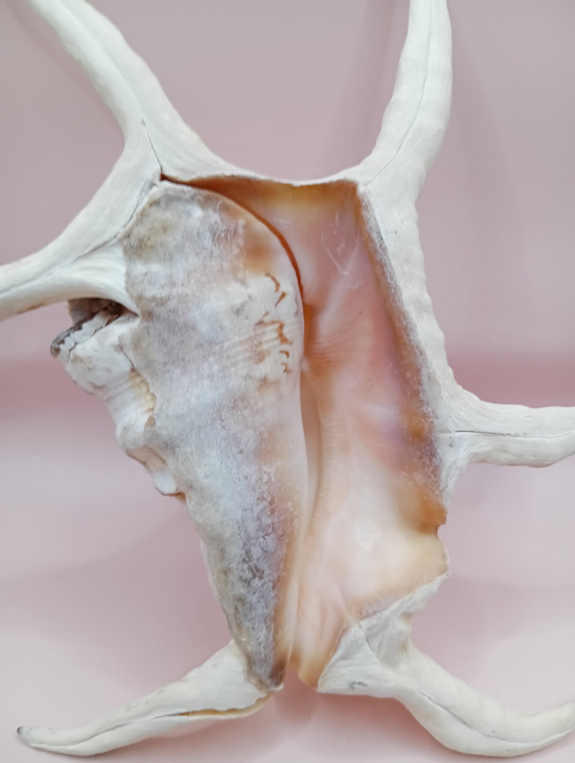 Invite a sense of exotic elegance into your coastal décor with this dramatic Lambis chiragra harpago, also known as the Spider Conch. With its striking elongated spines and stunning natural contrast between chalky white exterior and warm peachy pink interior, this rare shell commands attention. Its sculptural form and ocean-worn texture make it a stunning focal point for any coastal shelf or natural history display.