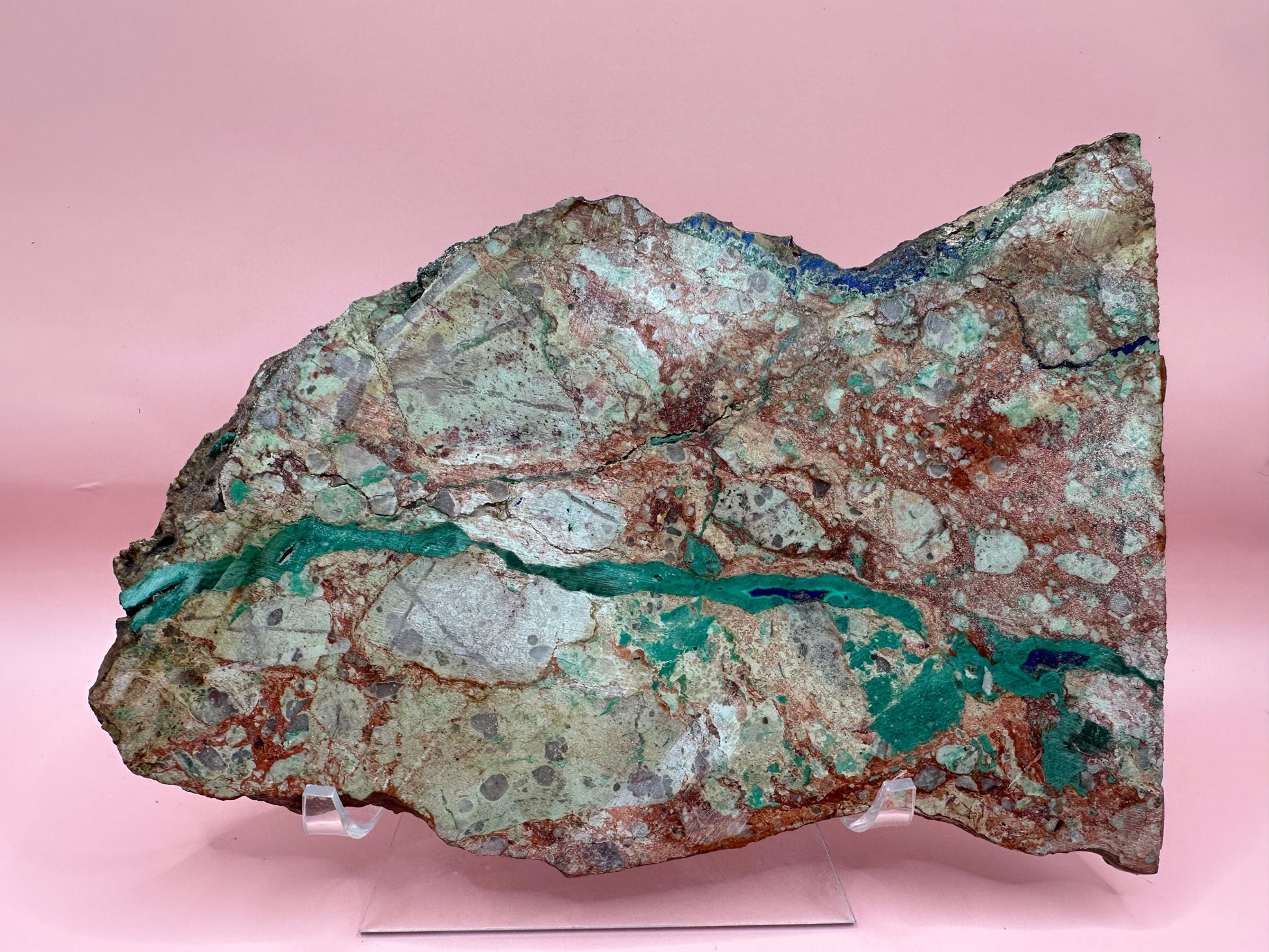 This eye-catching Malachite Azurite Slab is a bold composition of earthy reds, pale greens, and vibrant turquoise veining—nature’s abstract masterpiece in stone. With its one side professionally sealed for protection and enhanced display, this specimen brings both natural drama and refined polish to your collection or decor.