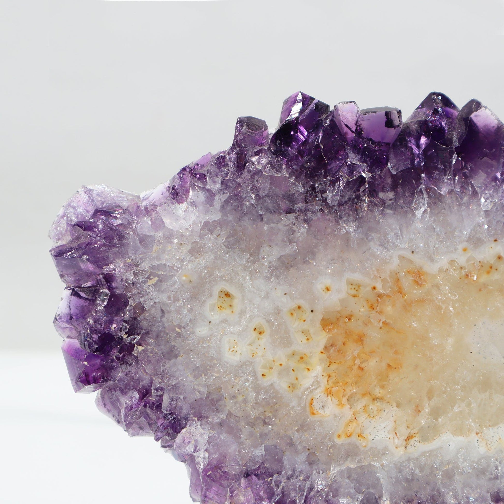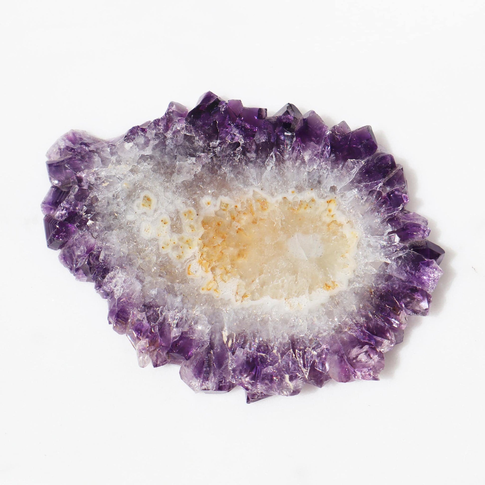 Mesmerizing in its deep traditional purple hue, this amethyst stalactite slice is a true wonder. Its remarkable transparency permits the passage of light, revealing a mineral composition where almost one hundred percent of the slice is comprised of crystals. These crystals exhibit a spectrum of colors, ranging from intense yellow to colorless, culminating in rich shades of purple.