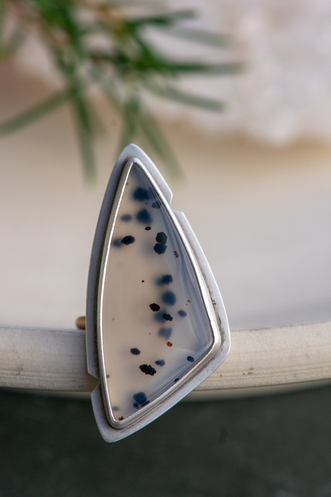 Merlin cut Montana agate set in sterling with a gold-fill accent.