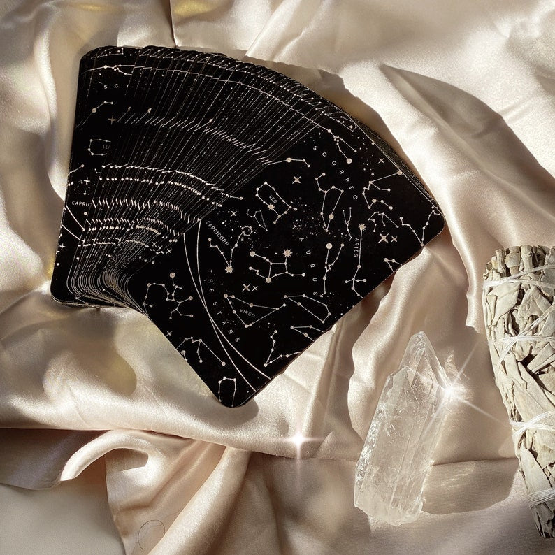 These cards are intricately designed, featuring celestial art designed by Annalise Dragonetti, the founder and creative director of Terra Soleil. The back of each tarot card has a mesmerizing zodiac constellation, with flecks of printed gold shimmer woven through the stars.