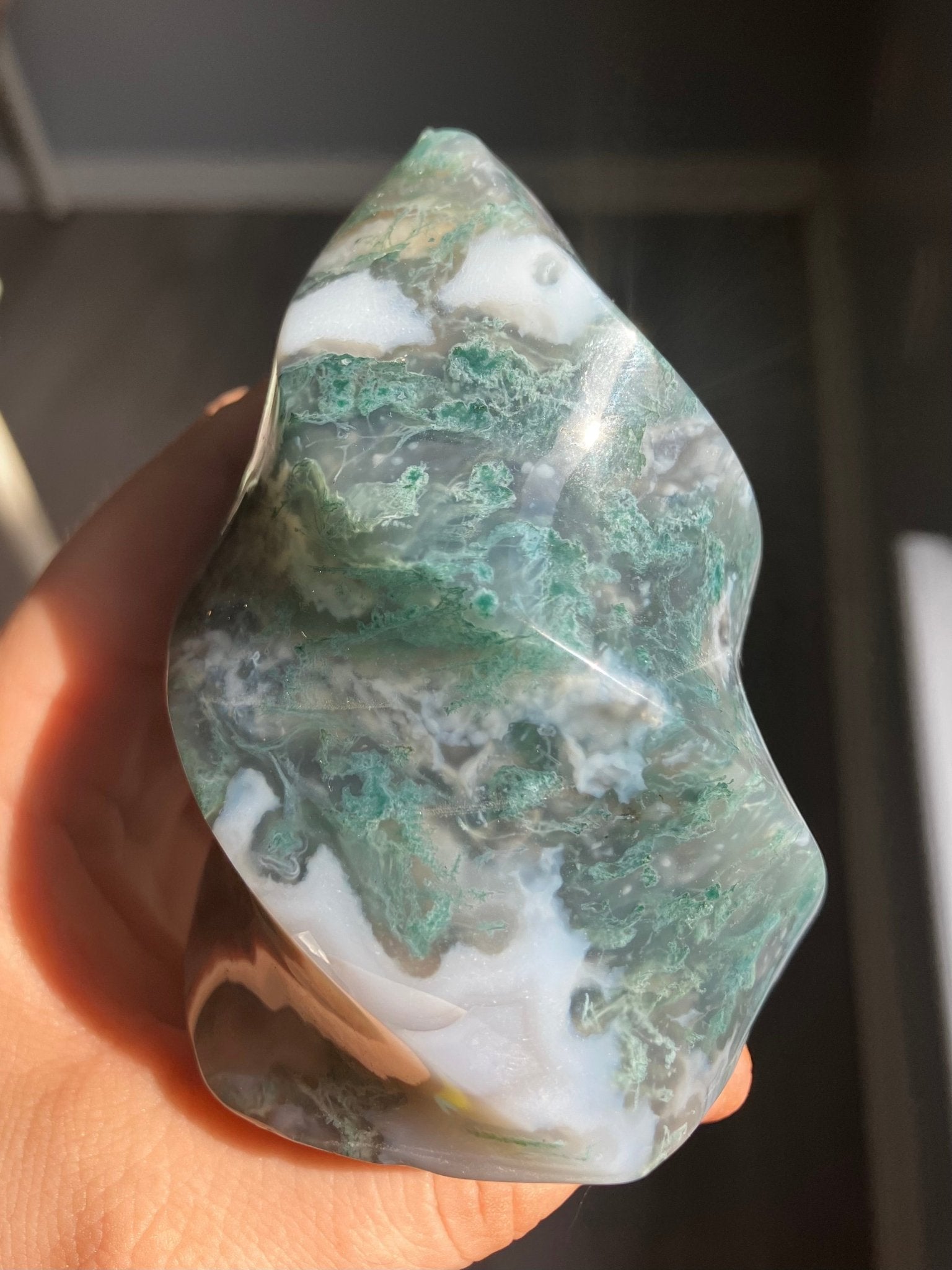 A stunning Moss Agate Flame, featuring natural blues, greens, and druzy quartz pockets. This freeform carving has intricate banding and a mesmerizing organic flow.