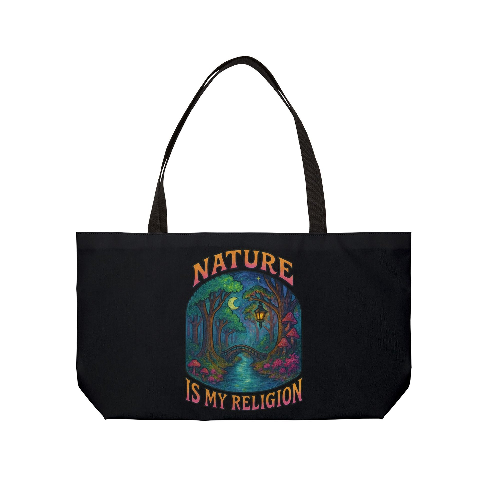 Carry your essentials with sacred style in the Nature is My Religion tote bag. Featuring a dreamy, hand-painted woodland scene of glowing mushrooms, moonlit trees, and a winding path, this tote celebrates the forest as a temple and the Earth as altar.