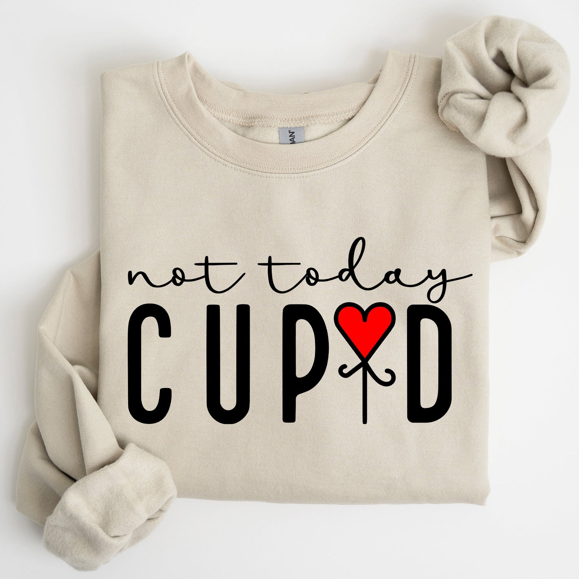 This Not Today Cupid, Valentine's Day, Heart Sweatshirt pairs effortlessly with jeans for a trendy, laid-back look. It can also be layered over your favorite shirts for added style, making it an ideal choice for casual outings or cozy nights in.