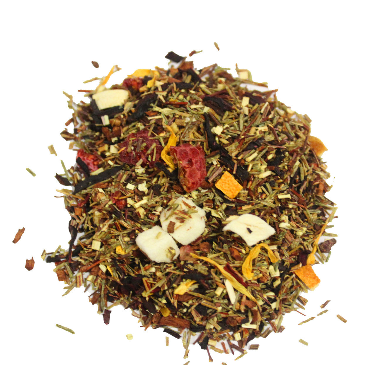 Ingredients: Green rooibos, honey bush, hibiscus flower, orange peel, pomegranate, peaches, raspberries, safflower, marigold, and natural flavoring.