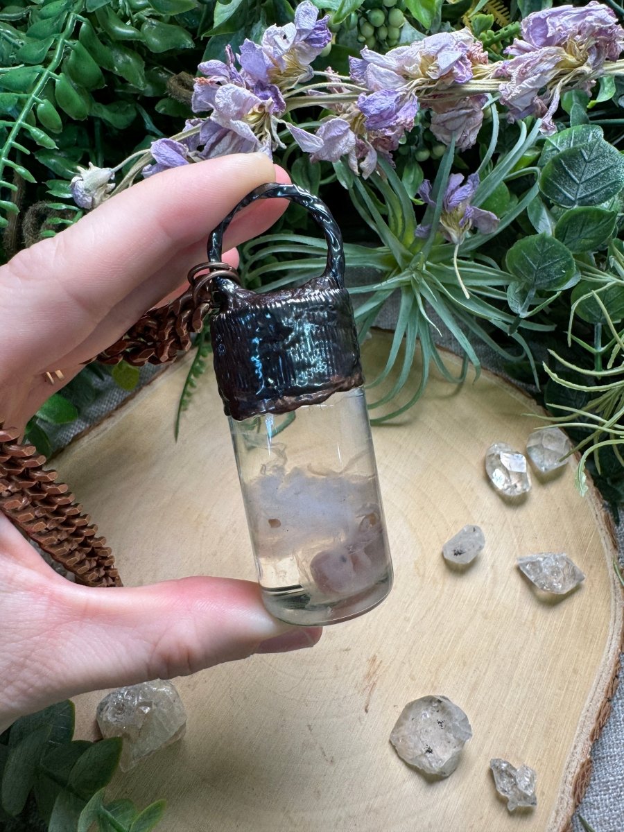 This necklace is made with copper and a real pig fetus that has been preserved in this vial. This pendant hangs from an 18" copper chain necklace.