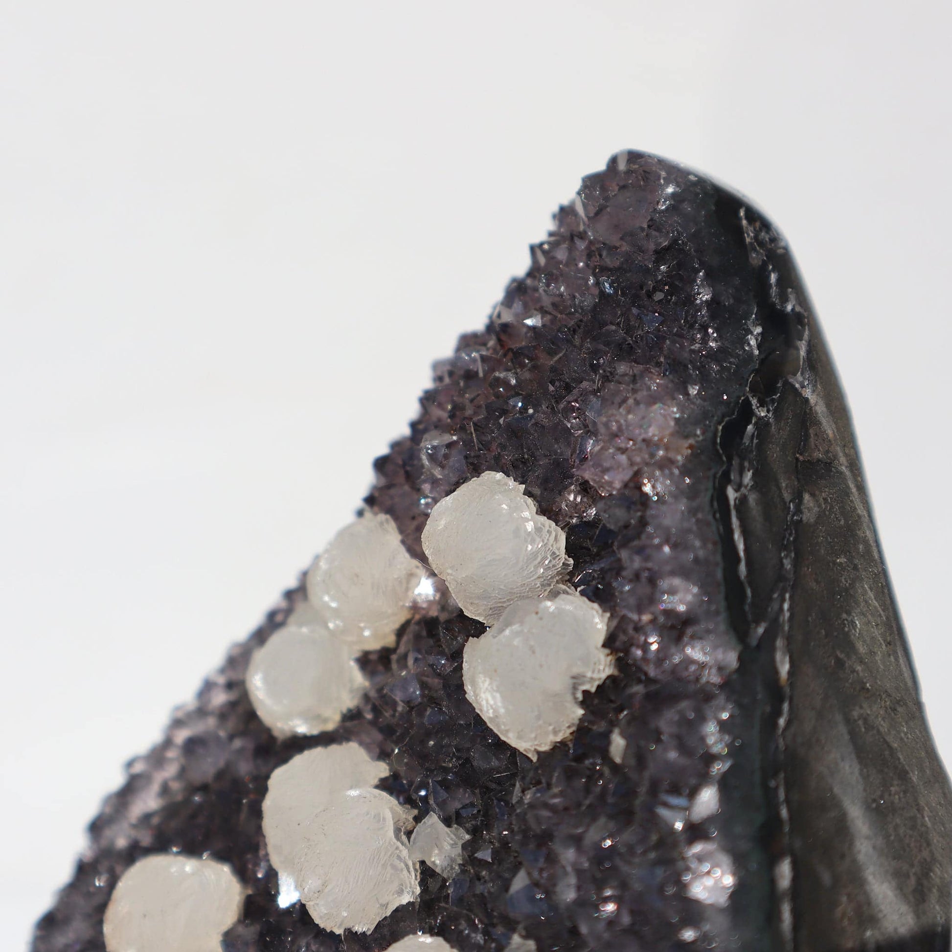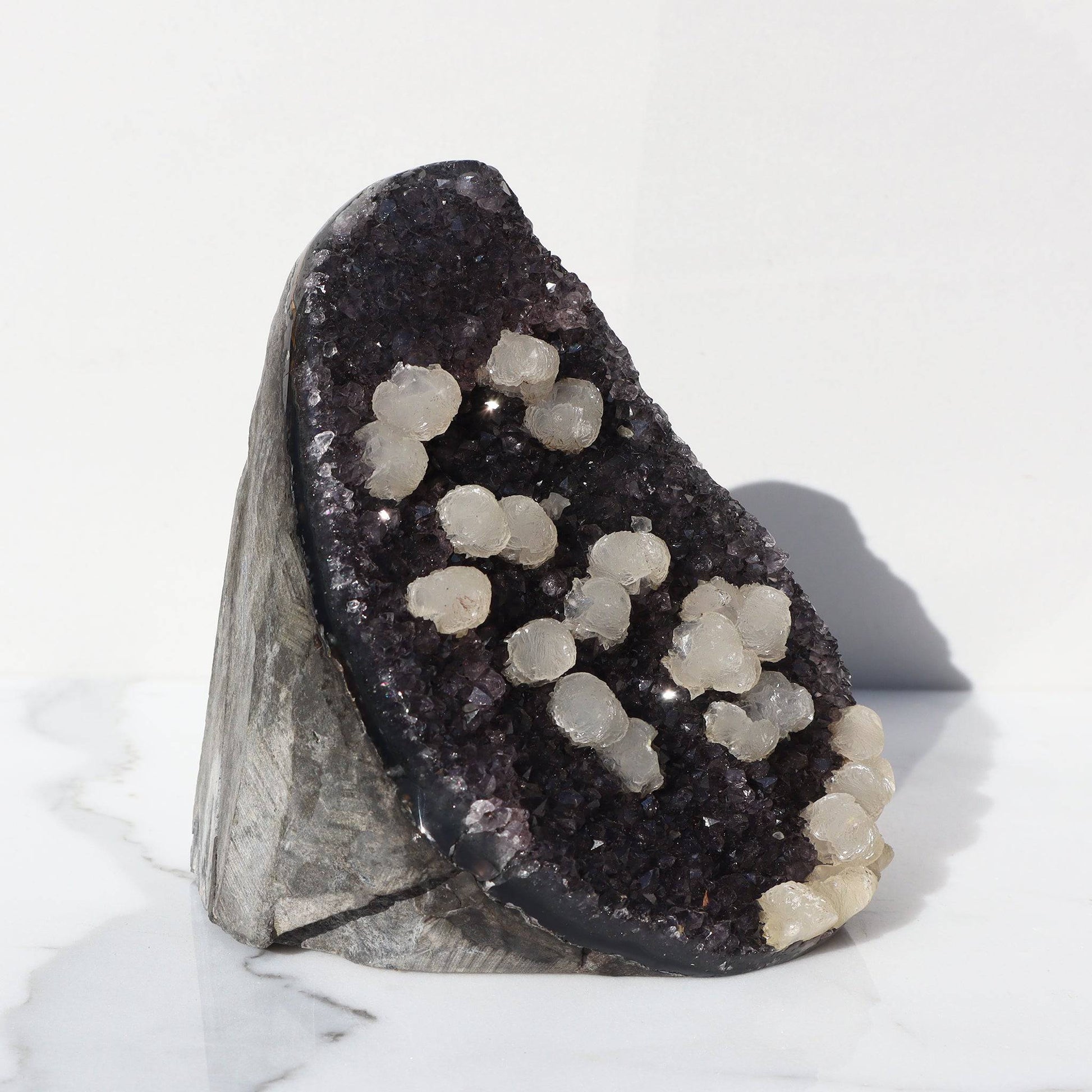 This enchanting arrangement exudes a playful and distinctive charm, rare amethyst popcorn-shaped calcites resembling specimen. The quartz, with its alluring light pewter tones, stands out in an unpaired and delightfully unusual display. Its crystals possess a captivating sparkle that is truly mesmerizing. Sourced ethically from the renowned lands of Uruguay, this piece is not only unique but also carries a touch of charm.