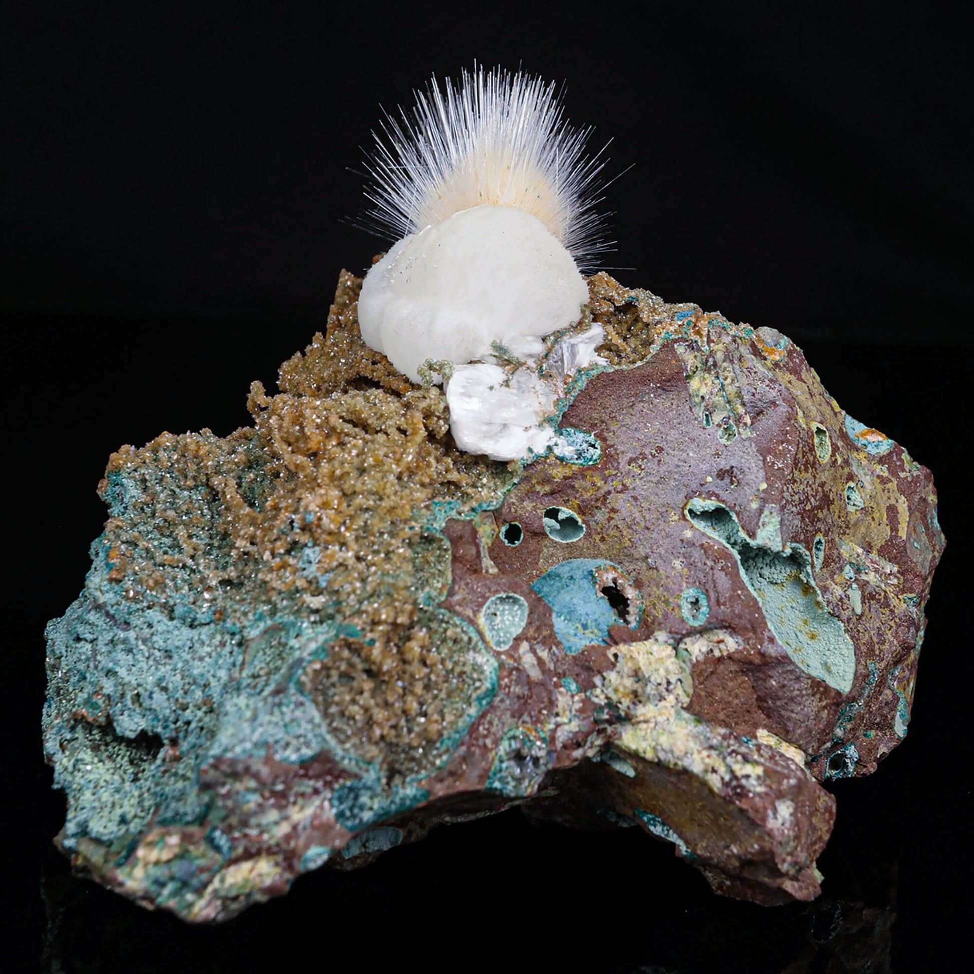 What sets this specimen apart is its unparalleled shape, unlike anything you've seen before. It boasts a form that is both intriguing and visually striking, instantly drawing attention to its exceptional beauty. The combination of the Thomsonite clusters in a botryoidal growth pattern with Mesolite Spikes adds a touch of elegance and allure to the overall composition, making it a true masterpiece of natural art.
