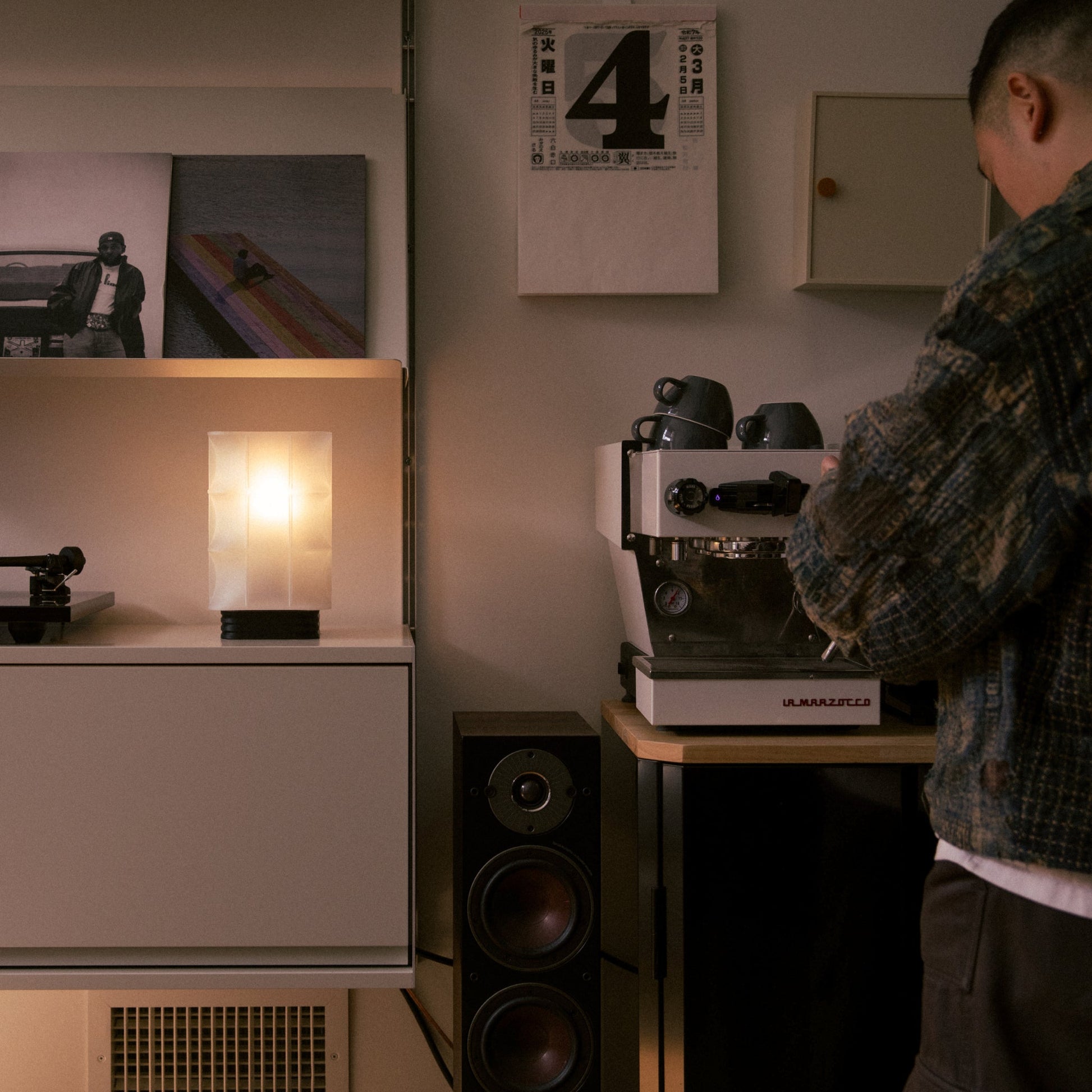 Designed in collaboration with Nigh Collective, the Scaffold Lamp takes inspiration from paper lanterns, emulating the effect of a grid cage tightly wrapped in paper. This allows for it to juxtapose the repetitive, structured pattern with playful curves, present in the shade on a large scale and mirrored on the base in a smaller, convex form.