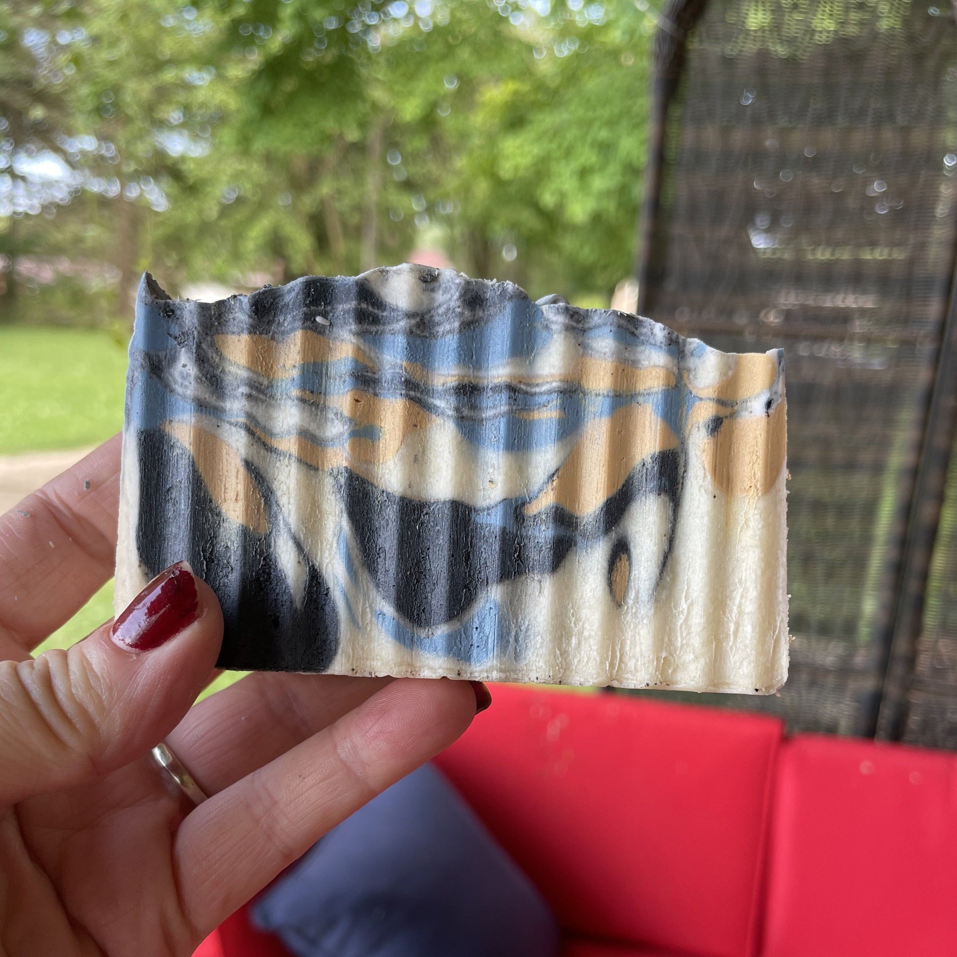 Note: Each batch and bar of soap is unique in its appearance which makes it beautiful. The bars are all hand cut with a crinkle cutter making your washing experience more invigorating.