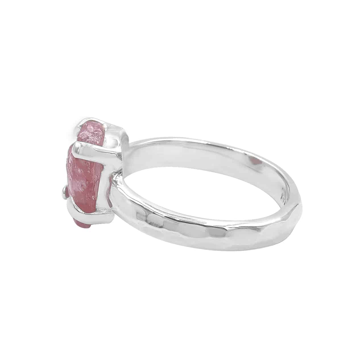 - A graceful statement of love and balance, this Rhodonite ring is expertly handcrafted in Fine Sterling Silver. It features a striking natural Rhodonite centerpiece, beautifully set atop a 4mm hammered shank for a touch of artisanal texture and timeless charm.