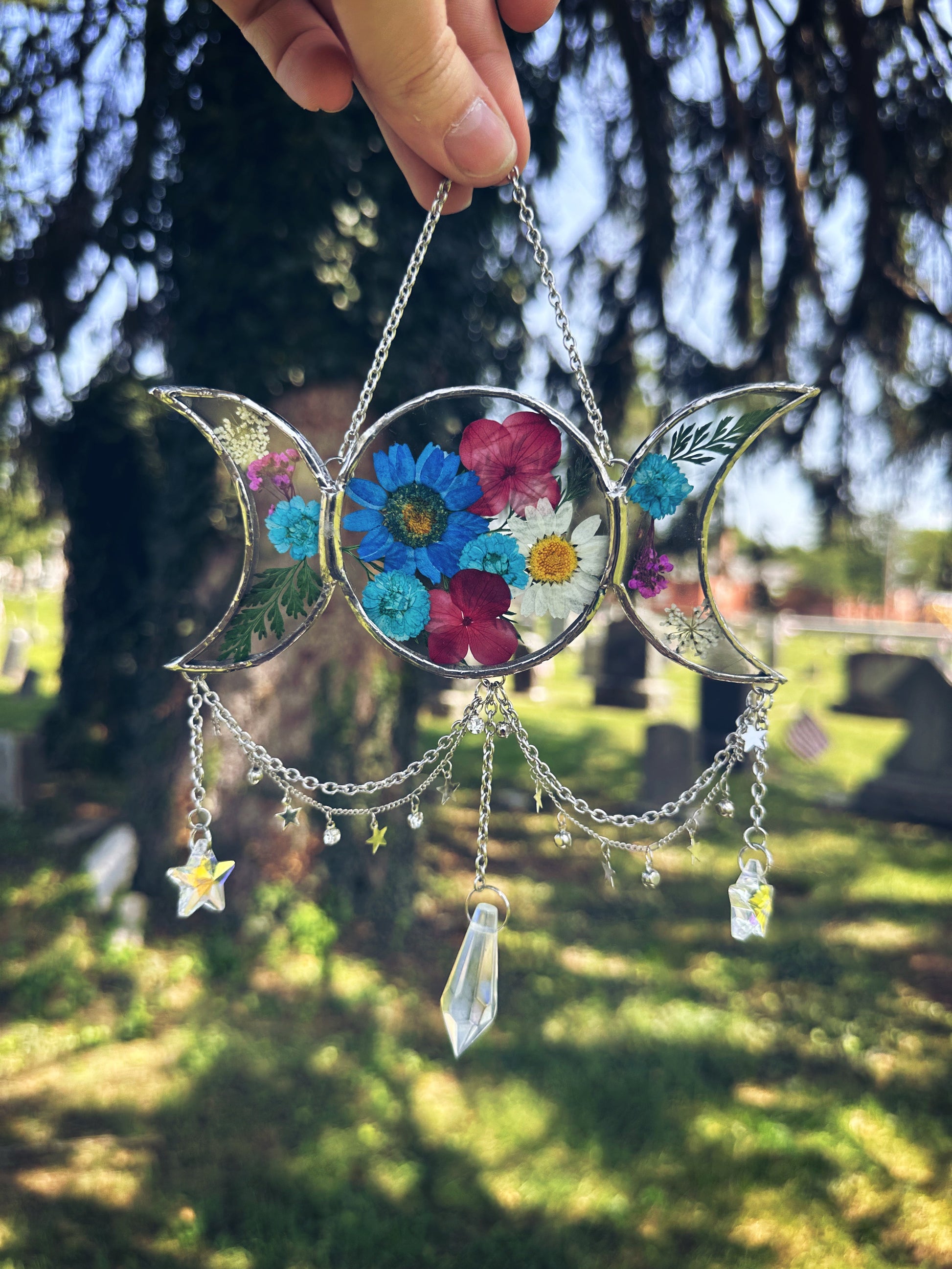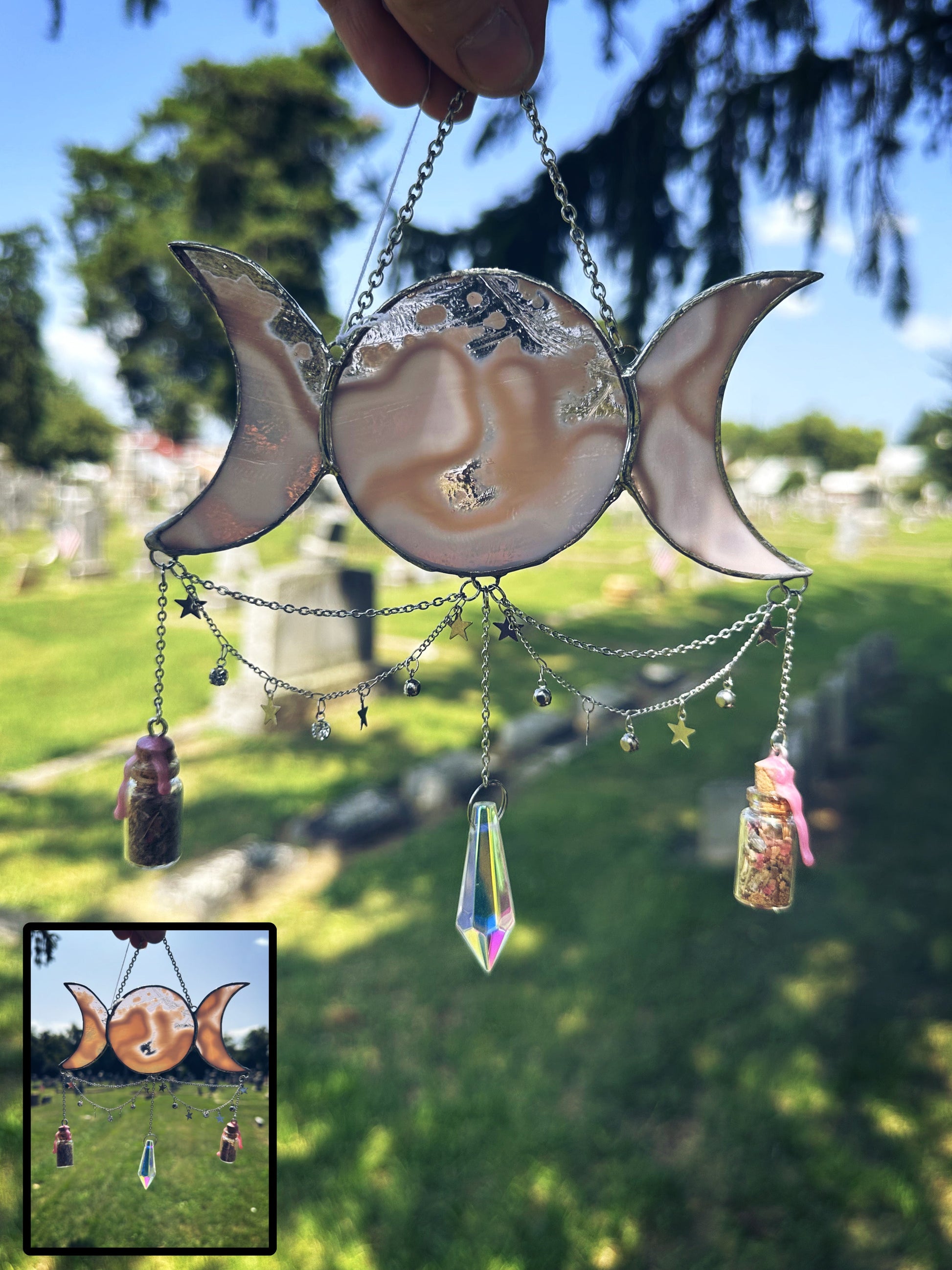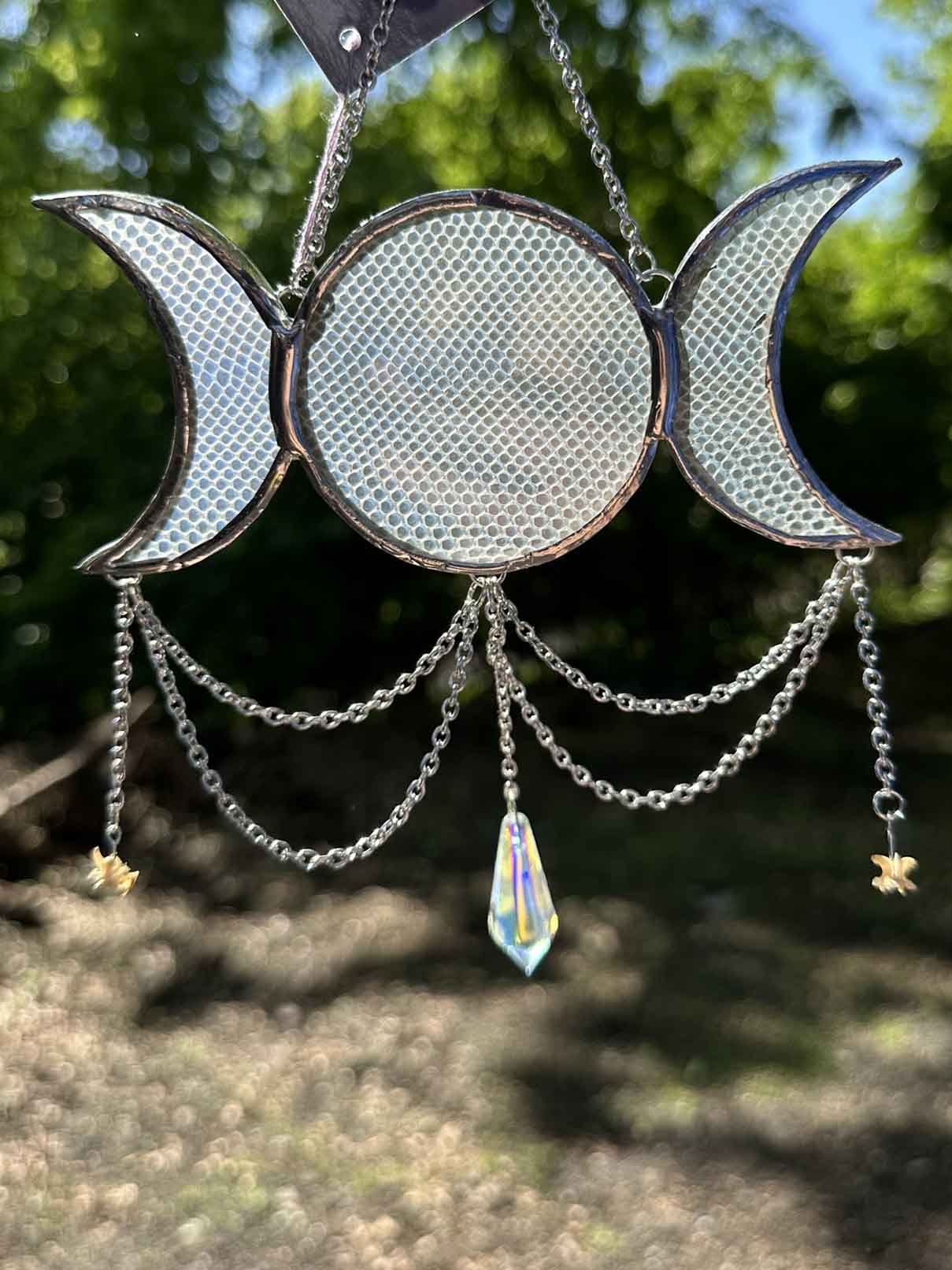Bring a little magic to any interior with this enchanting stained glass Triple Moon sun catcher. Hang it in your windows and let its three crescent moons bring a touch of celestial light into your home!
